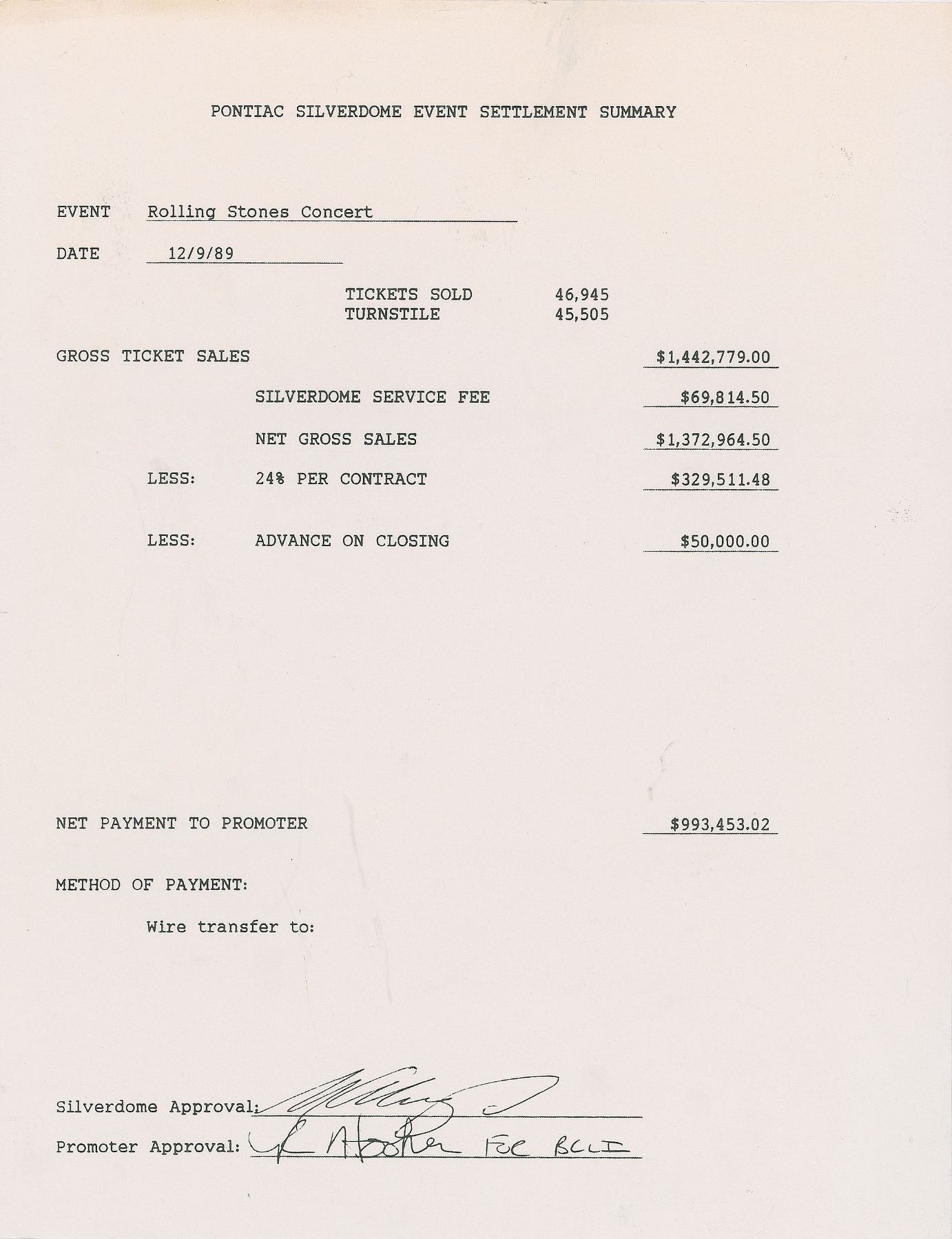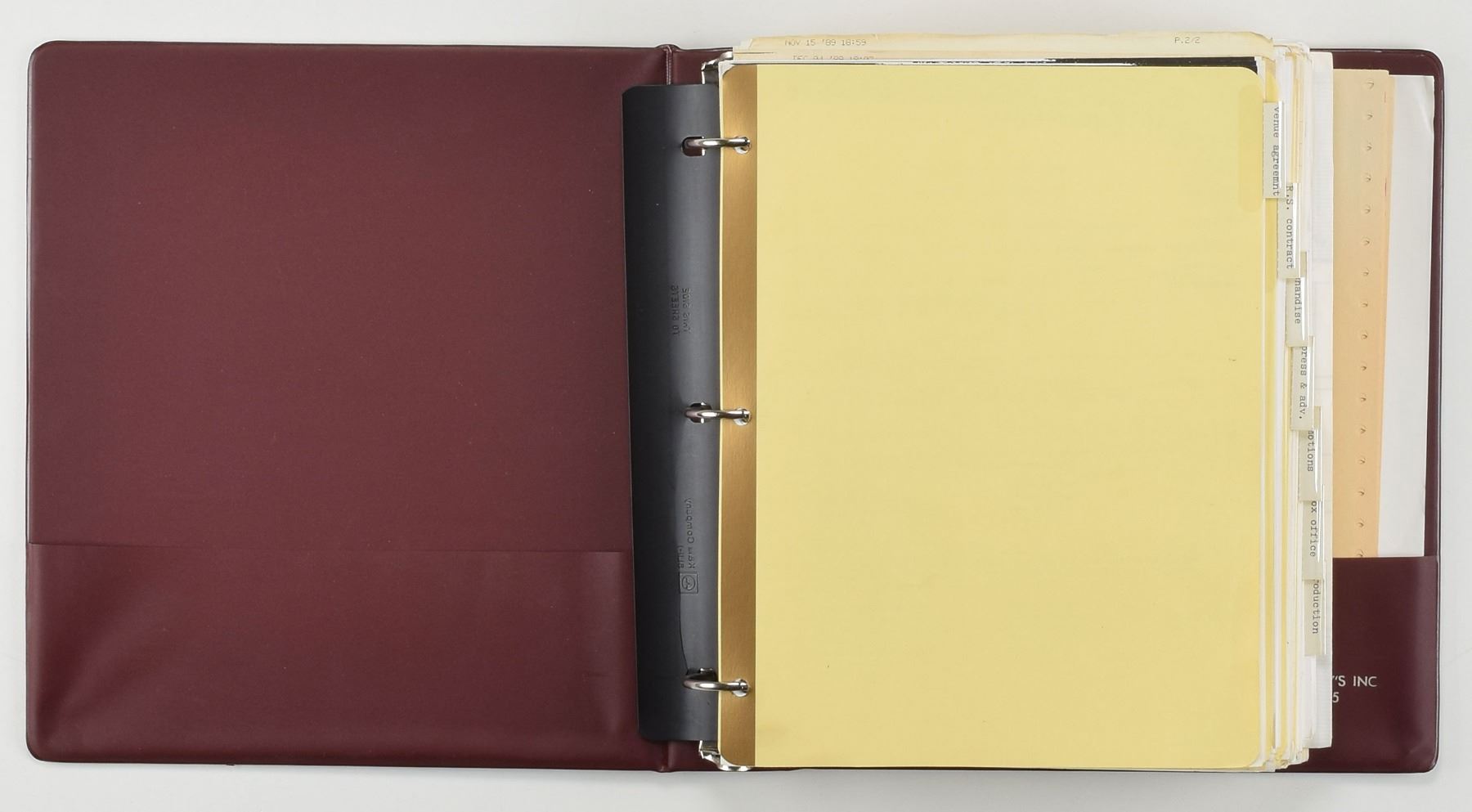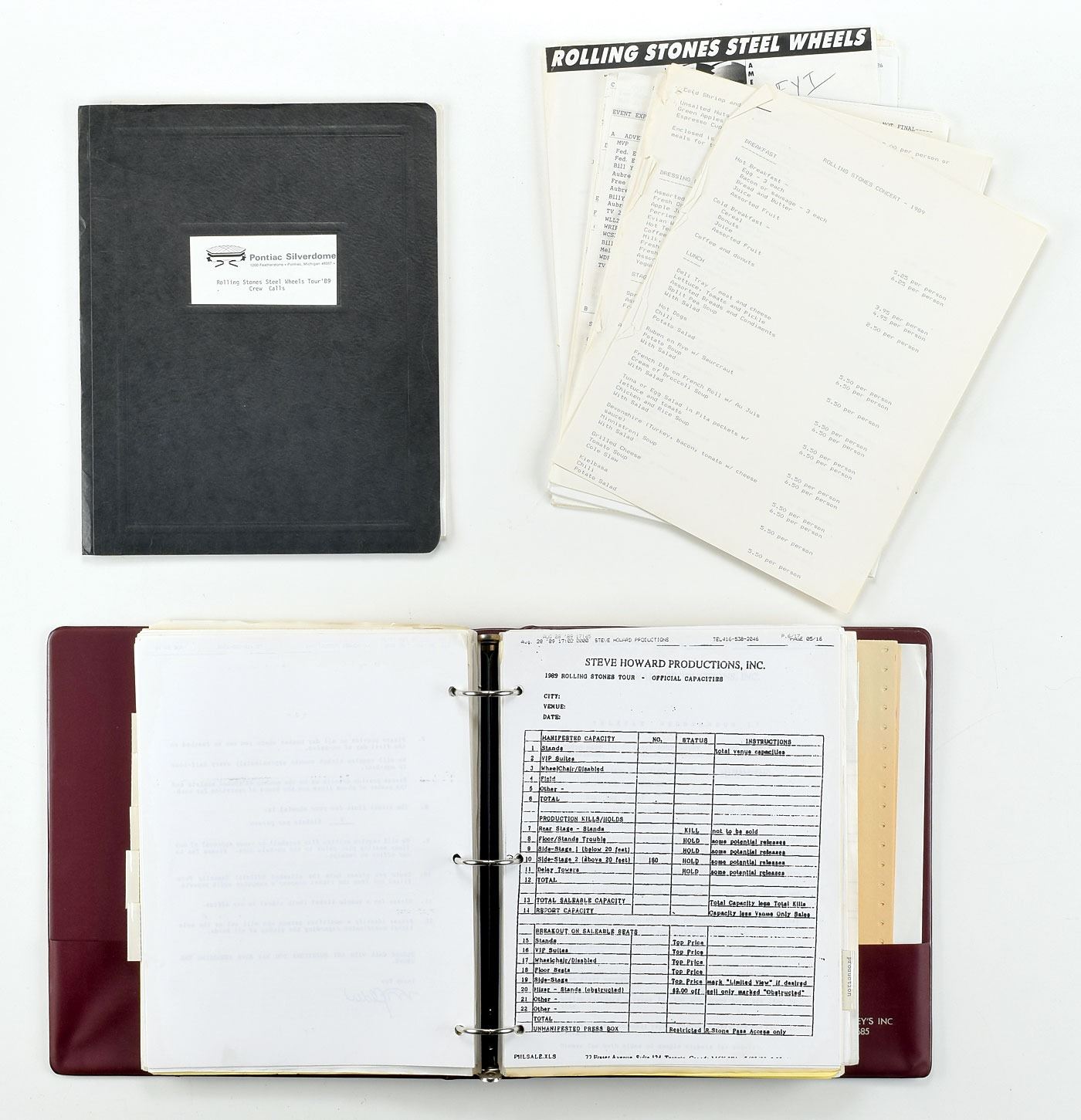 Extensive production binder for the Rolling Stones’ two shows at the Pontiac Silverdome in Pontiac, Michigan, on December 9 and 10, 1989, as part of the band’s enormous Steel Wheels Tour. The maroon 10.5 x 11.75 binder, with ‘tongue and lips’ logo sheet affixed to front cover, consists of a multitude of letters and documents relating to all aspects of production; the binder is divided into 15 sections, with tabs reading as follows: Venue Agreement, R. S. Contract, Merchandise, Press & Adv., Promotions, Box Office, Production, Costs Ests., Dressing Rms., Hospitality, Transportation, Labor, Rentals, Steel Labor, and Security. Also included within is an itinerary folder entitled “Rolling Stones Steel Wheels Tour ’89, Crew Calls.” In overall fine condition. Launched in North America in late August 1989 to promote the band's comeback album, the Steel Wheels Tour was enormously successful and the longest tour the band had ever done up to that point, playing over twice as many shows as their standard tour length from the 1960s and 1970s. Additionally, the Steel Wheels Tour was the last to feature original member Bill Wyman on bass guitar.