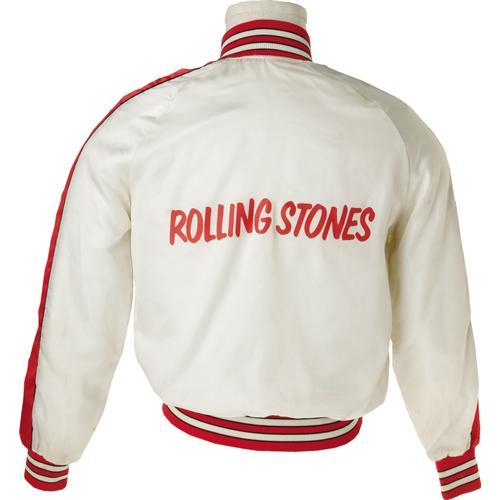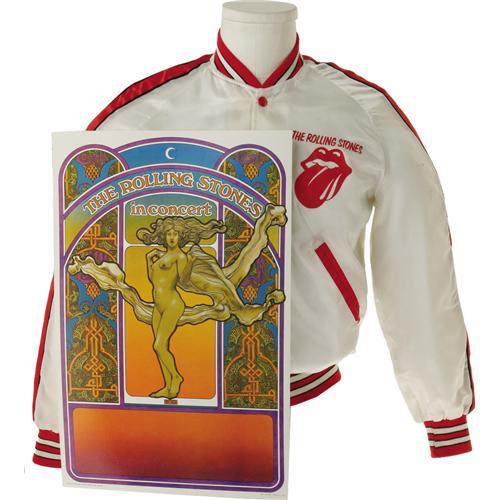 <B>Rolling Stones Tour Jacket with Concert Poster.</B></I> A white satin jacket with red trim, featuring "Rolling Stones" printed on the back and the band's lips logo on the left breast. Also include is A 14" x 21.5" poster for a 1969 performance. Both are in Excellent condition with some small stains on the front of the jacket.<I>From the Robert Johnson Memorabilia Collection.</B></I><BR><BR><b>Shipping:</b> Clothing, Costumes & Jerseys (<a target="_blank" href="http://www.heritageauctions.com/common/shipping.php">view shipping information</a>)