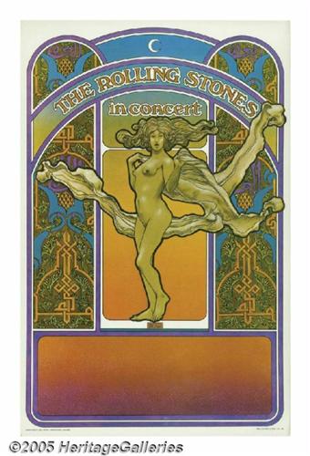 <B>Rolling Stones Tour Posters, Group of 10.</B></I> Here is a group lot of 10 unused copies of one of the posters for the Rolling Stones 1969 concert tour. The beautiful psychedelic design features a voluptuous nude standing above an open area at the bottom of the poster used for writing in venue and show date info. All are in NM- condition with little if any wear.