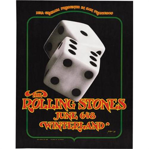 <B>Rolling Stones "Tumbling Dice" Winterland Concert Poster BG-289 (Bill Graham, 1972).</B></I> A very popular poster from one of the best Rock bands in the world! This is the coveted first-printing version, with the "white line" visible along the lower left edge of the upper die. This oversized poster, designed by David Singer, measures approximately 22" x 28", and is in NM- condition.<BR><BR><b>Shipping:</b> Flat Material, Large (<a target="_blank" href="http://www.heritageauctions.com/common/shipping.php">view shipping information</a>)
