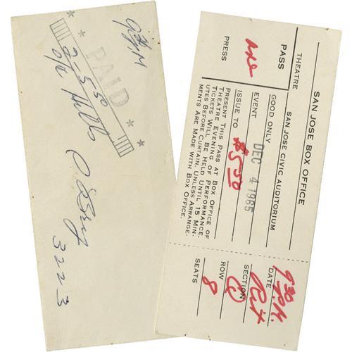 <B>Rolling Stones Unused Concert Ticket (1965).</B></I> Were you at the Rolling Stones December, 4, 1965 concert in San Jose, California? Approximate 6,000 fans were at the two sold-out shows presented at the San Jose Civic Auditorium. Presented in this lot is one unused ticket for the 9:30 p.m. show, along with the original small-sized ticket envelope, and a letter from the original owner describing the event (either no stub was retained at the show, or this was an extra ticket purchased as a souvenir). Also included is a photocopy of a newspaper article that quotes the original ticket holder. All items are in NM- condition.