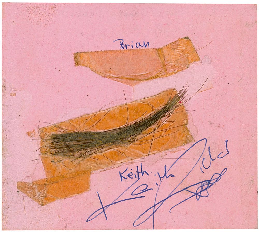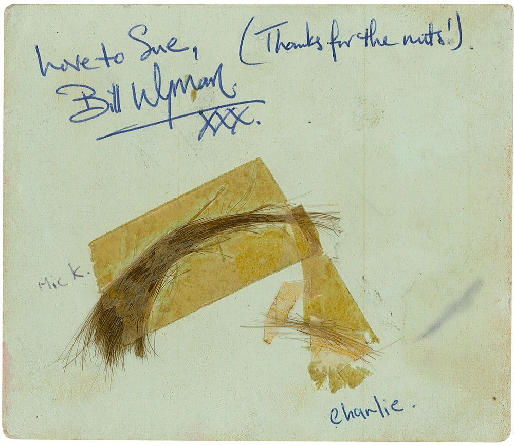 Vintage ballpoint signature and inscription, “Love to Sue, Bill Wyman”, with a small clipped photo affixed to lower right “(Thanks for the nuts!),” and “Keith Richards,” on individual 4.5 x 4 colored album pages. Wyman’s page also has locks of hair from Mick Jagger and Charlie Watts taped to the front, with Richards’s page having locks of Keith’s and Brian Jones hair taped to the front. Richards’s page is affixed to the removed back cover of an autograph album. Scattered toning and soiling, small collector’s notations, and toning to tape, otherwise fine condition.