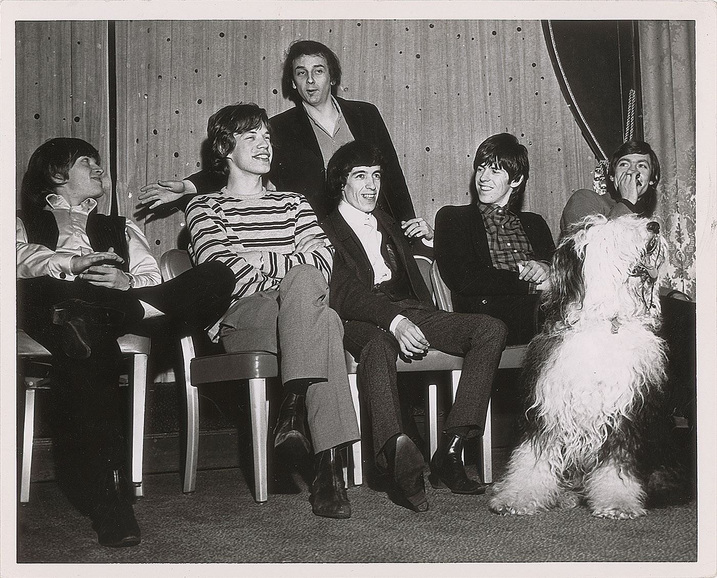 Vintage circa 1960s glossy 10 x 8 photo of the Rolling Stones with Phil Spector and a large dog, printed from the original negative by legendary New York photographer William 'PoPsie' Randolph, with reverse bearing his New York studio stamp. In fine condition.