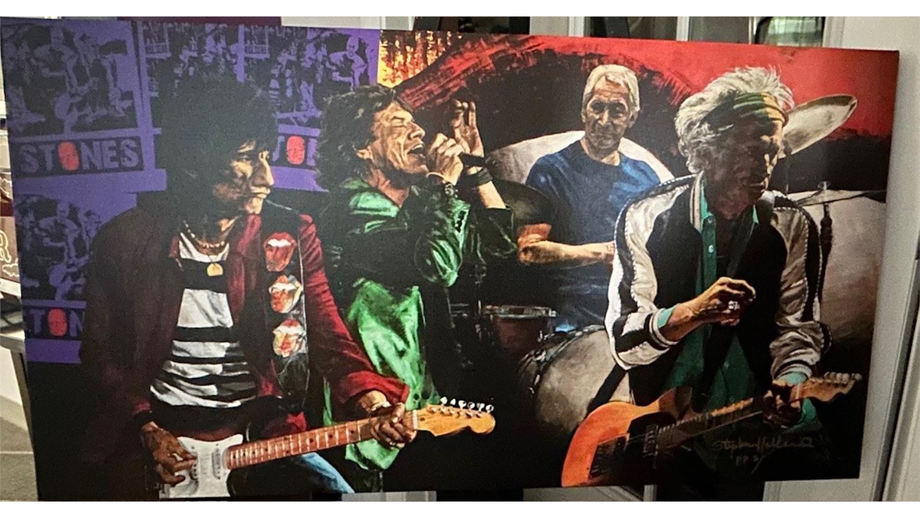 A dynamic image of the Rolling Stones by Stephen Holland is a 24.5" x 46" giclee PP3 on boxed canvas, with COA