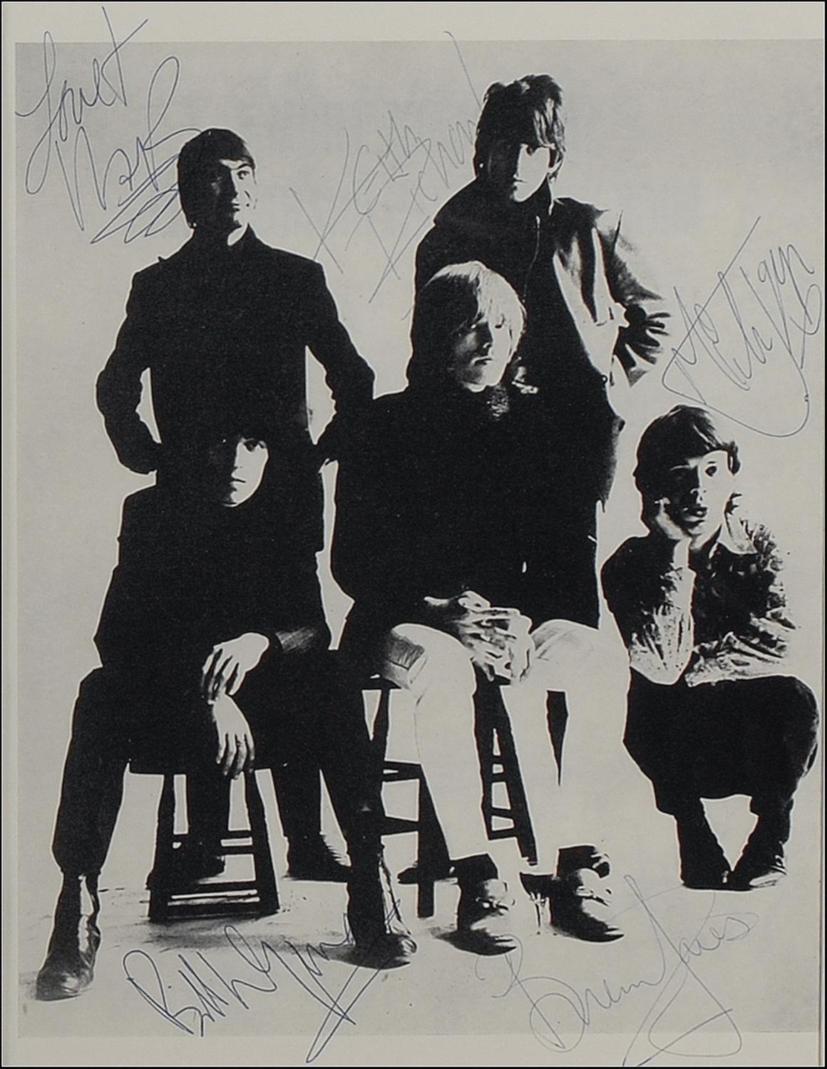 Vintage 8 x 10 tourbook photo of the band, likely late 1966 or early 1967, signed in blue ballpoint by Mick Jagger, Keith Richards, Brian Jones, Bill Wyman, and Charlie Watts. Matted and framed with a color lenticular image of the band from their their Satanic Majesty’s Request album, to an overall size of 24.75 x 16. In fine condition. Difficult to find in vintage photos signed by all five, especially given the approximate date of the photo, Stones fans last chance to see Brian Jones, the founder of the band, perform. Oversized.