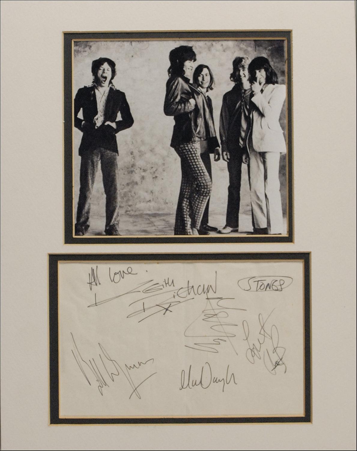Vintage black felt tip signatures of Mick Jagger, Keith Richards (adding “All love” and “Stones”), Bill Wyman, Charlie Watts, and Mick Taylor on an off-white 7.5 x 4.75 sheet. Double matted with a photo of the band to an overall size of 11 x 14. In very good condition, with central vertical fold and mild to moderate creasing and wrinkling. Taylor joined the Stones in 1969 and abruptly left the band in December 1974. This specific lineup with Mick Taylor which produced the albums Let in Bleed, Exile on Main Street, Sticky Fingers, and Goat Head Soup is considered by fans and critics alike as the Stones most prolific and creative peak. Quite uncommon to find all five signatures on one piece.