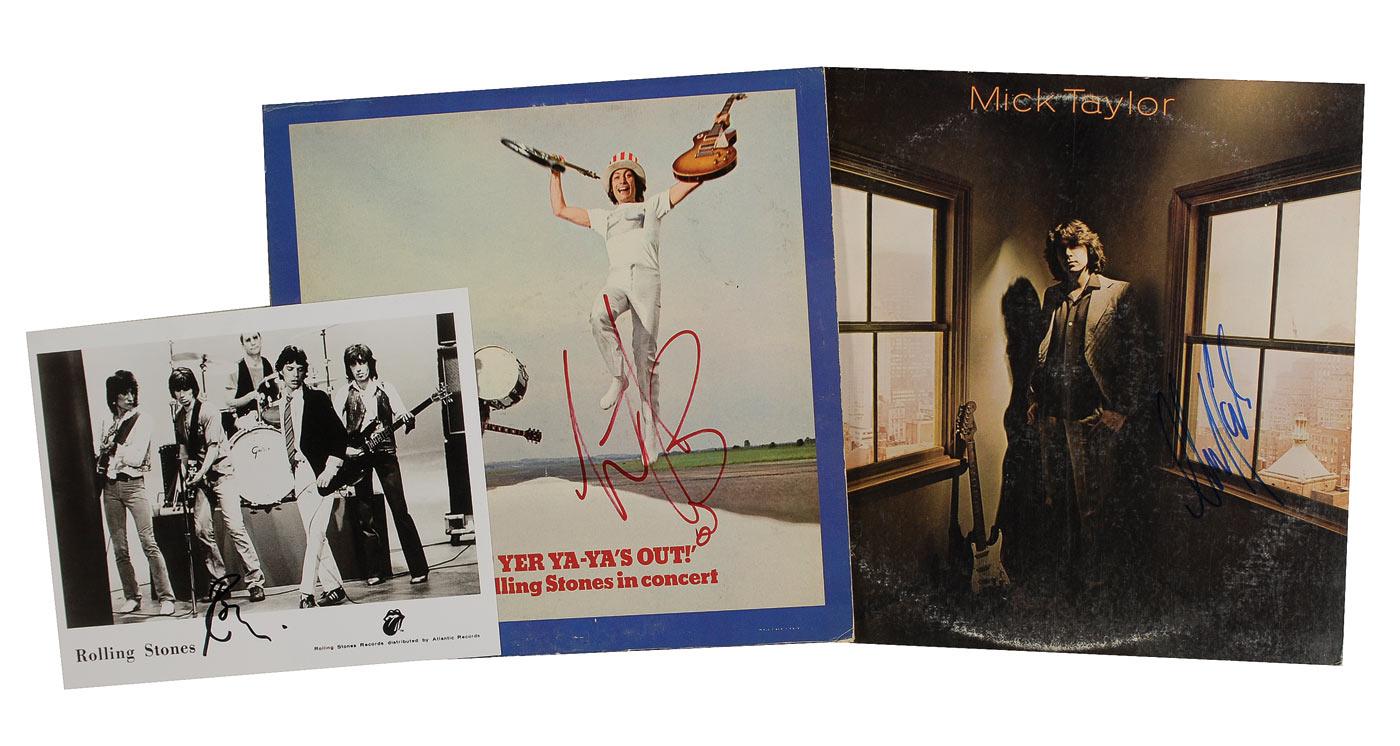 Three items; ‘Get Yer Ya-Ya’s Out!’ album, signed on the front cover in red felt tip by Charlie Watts; Mick Taylor’s self-titled album, signed on the cover in blue felt tip; and a satin-finish 10 x 8 group photo of the Stones, signed in black felt tip by Ronnie Wood. The albums are included. In fine condition, with scattered wear and creases to album’s covers and edges.