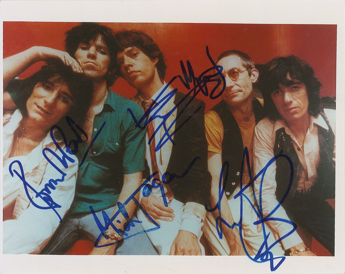 Color glossy 10 x 8 group photo, signed in blue felt tip by Mick Jagger, Keith Richards, Ron Wood and Charlie Watts. In fine condition, with a few light surface marks and some slight irregular adhesion to Jagger’s signature.