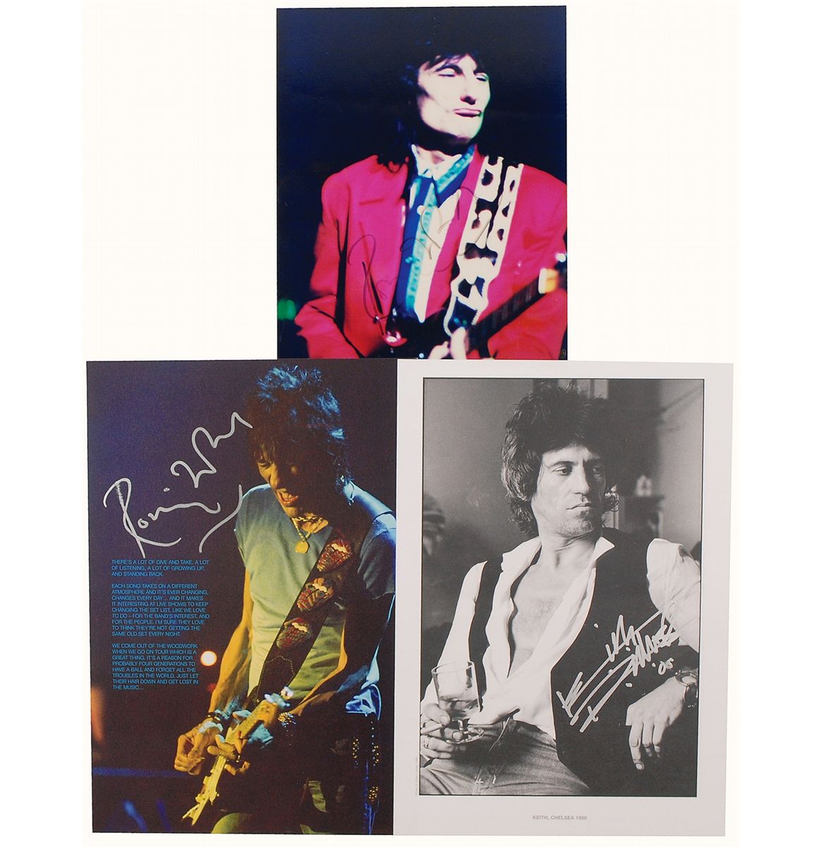Three photos: a color 9 x 13 tour program photo of Ron Wood on stage, signed in silver ink; a 9.5 x 13 book photo of Keith Richards, signed in silver ink; and a color glossy 8 x 10 photo of Ron Wood, signed in black felt tip. In fine condition, with moderate contrast to Wood’s faded signature on the 8 x 10 photo.