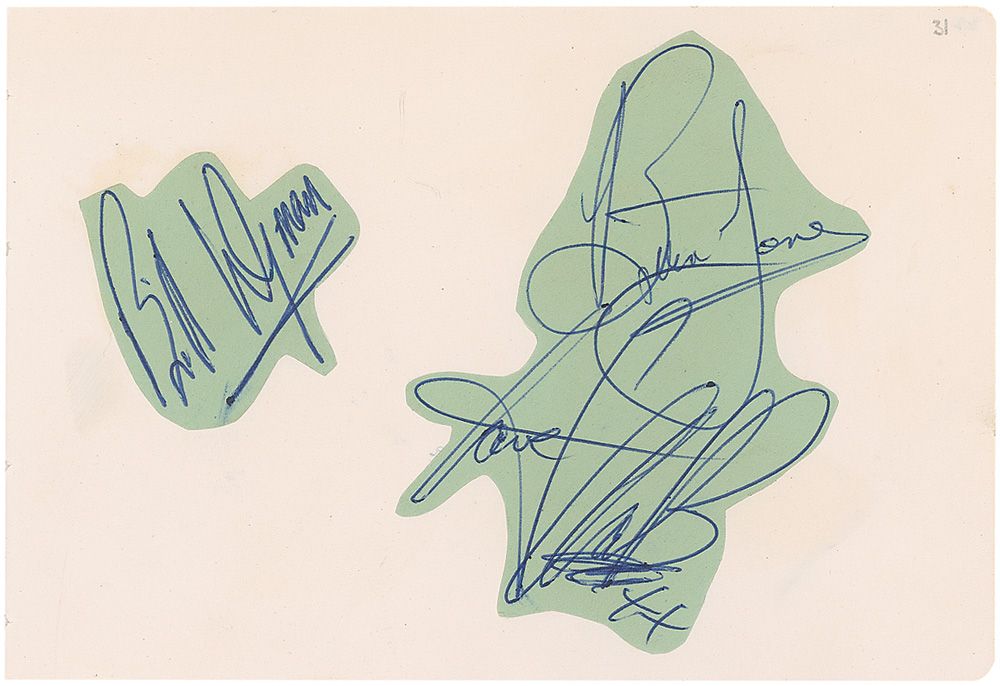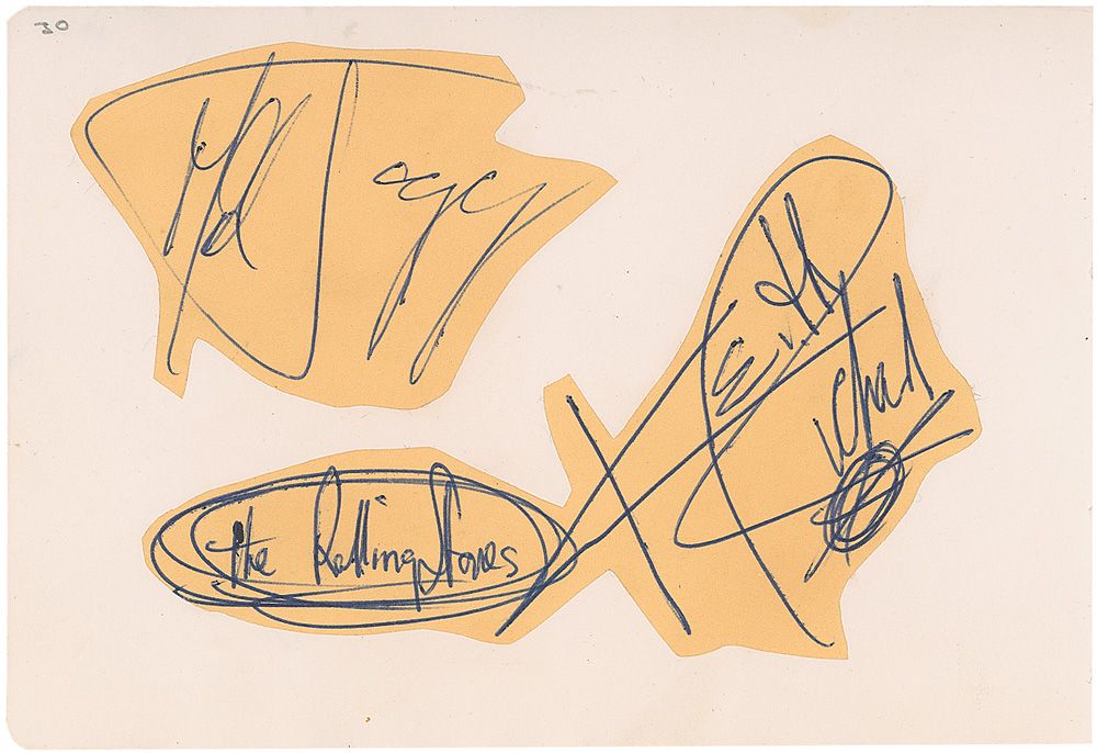 Four vintage closely trimmed ballpoint signatures affixed to two individual off-white 6 x 4 album pages, “Mick Jagger,” “The Rolling Stones, Keith Richards,” “Bill Wyman,” “Brian Jones,” and “Love, Charlie Watts xx.” In fine condition. Consignor notes that the signatures were obtained at their concert at the Gaumont Theatre, Ipswich, on October 2, 1966.