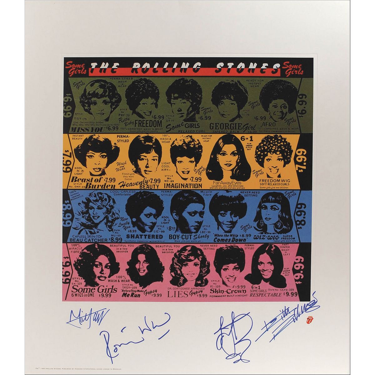 Color 22.5 x 26.5 print of the Some Girls album cover, signed in the lower border in blue felt tip by Mick Jagger, Keith Richards, Charlie Watts, and Ron Wood. In fine condition.