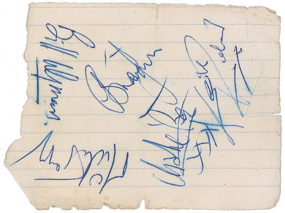 Vintage ballpoint signatures of Mick Jagger, Keith Richards, Brian Jones, Bill Wyman, and Charlie Watts, on an off-white 3.25 x 4 lightly-lined slip. Several central vertical folds, scattered creases, a few edge tears, and a rough left edge, otherwise very good condition.
