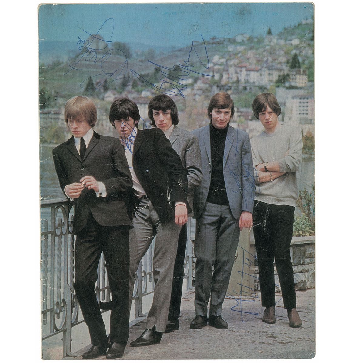 Vintage 1965 Rolling Stones UK tour program, 8 x 10.25, 16 pages. Signed on the front cover in blue ballpoint by Mick Jagger, Keith Richards, Brian Jones, Charlie Watts, and Bill Wyman. The center pages had become detached from another copy of the same program which is why the staple holes are in a slightly different place. In very good condition, with scattered creasing and soiling to cover, some light contrast to a few of the signatures, notations inside, and mild handling wear. Accompanied by a certificate of authenticity from Tracks. During 1965, the Stones began branching out, playing their first shows in Ireland, Australia, and Singapore. They also released their third album, ‘Rolling Stones, Now!’ which was considered a highlight of their early American releases. Anything signed from this early era is rare and highly coveted.