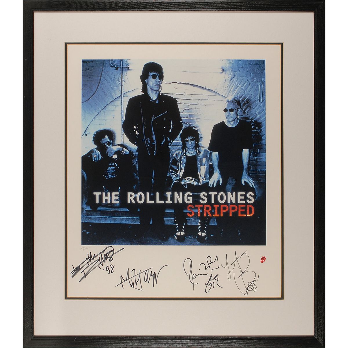Color extremely limited edition 19.25 x 23 lithograph for Stripped, numbered 13/15, signed in the lower border in black felt tip by Mick Jagger, Ronnie Wood, Keith Richards, and Charlie Watts. Double-matted and framed to an overall size of 27.75 x 31.75. In very fine condition.