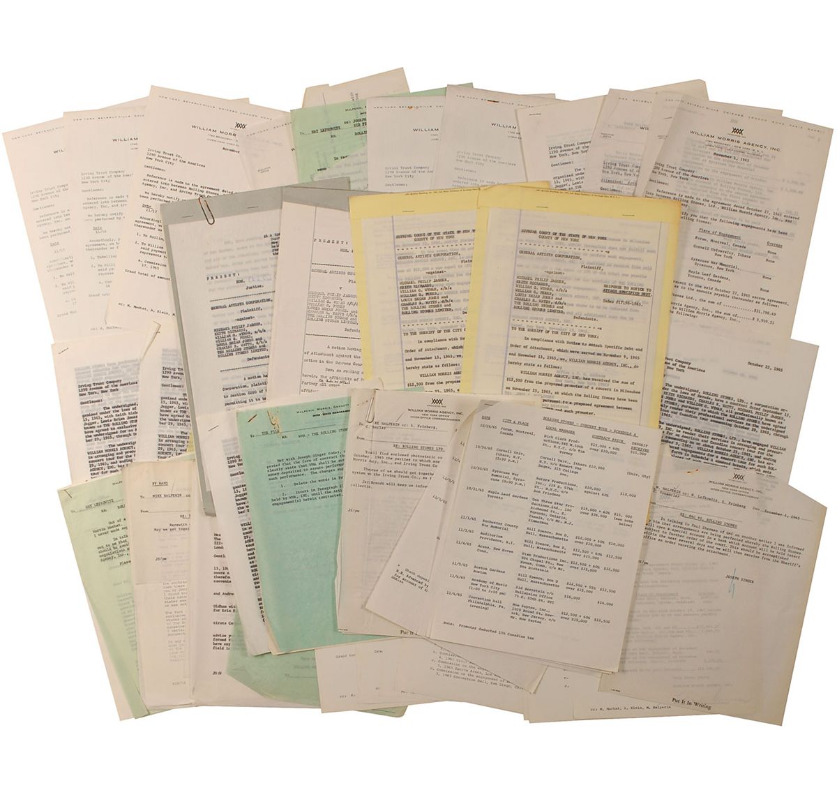 Extensive Rolling Stones legal file, consisting of over 50 original and facsimile unsigned legal documents and correspondence from the William Morris Agency, dated October 1965. Most involve finances, tour dates, or contracts. In overall very good to fine condition, with various creases, toning, staple holes, and rusty paperclip marks and impressions.