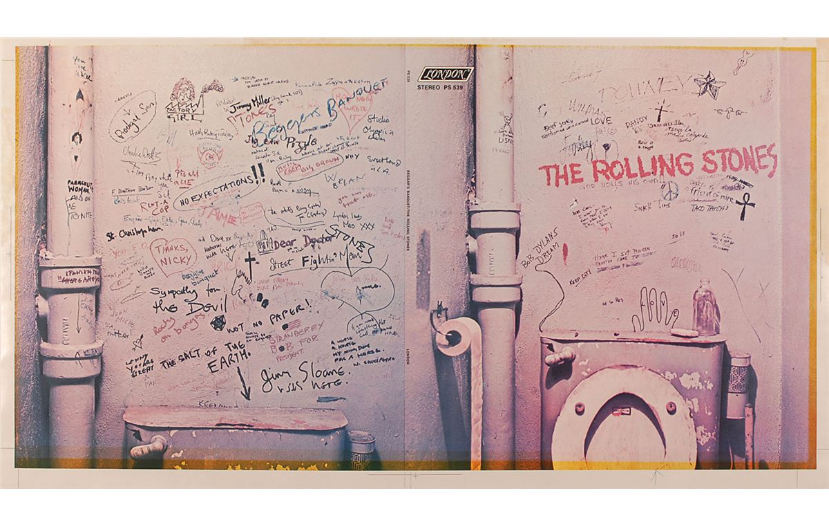 Extremely rare cover proof of the Stones banned cover art for Beggars Banquet. Proof measures 26.25 x 14 and shows a graffiti-covered lavatory wall, with the band and album names printed down the center. In fine condition, with some light toning and foxing to edges, as well as several crop marks and notations to the edges. The cover was originally done by Tom Wilkes, Michael Vosse and Barry Feinstein, along with Mick Jagger and Keith Richards, who did the graffiti on the back. The band loved it, but Decca in London and its United States subsidiary, London Records, rejected the design. After months of arguing, the Stones gave in and went with the simple ‘white invitation cover’ and the album was released in December of 1968. This London Records cover proof hung in a London executive's office for years and was acquired directly from him in 1997. An incredibly rare find, this particular cover proof has been know to sell for $8,000–10,000.