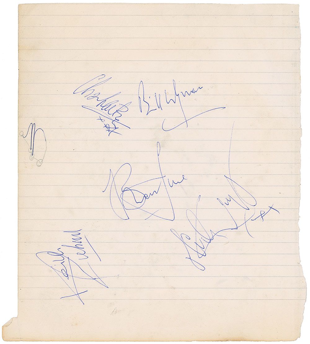 Stellar vintage ballpoint signatures of Mick Jagger, Keith Richards, Charlie Watts, Brian Jones, and Bill Wyman on an off-white 7.75 x 9.25 lightly-lined sheet. In very good condition, with a rough right edge, light overall creasing with some lightly affecting the signatures, toning to edges, an ink notation in another hand towards the left edge, and a handful of staple holes not affecting the signatures.