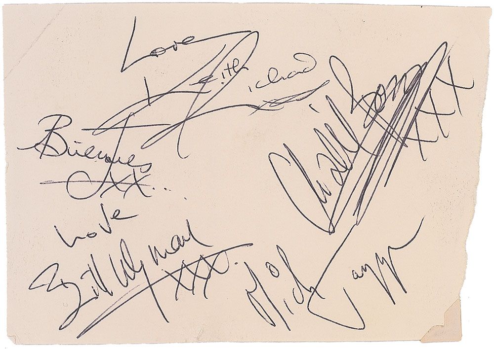 Vintage ballpoint signatures of Mick Jagger, Keith Richards, Brian Jones, Bill Wyman, and Charlie Watts, on an off-white 5.75 x 4.25 album page. An uneven right edge and some light wrinkling, otherwise fine condition. Accompanied by a handwritten letter of provenance from the original recipient which states: “The Rolling Stones autographs were obtained by me circa 1963 at their show at Urmston Baths.”