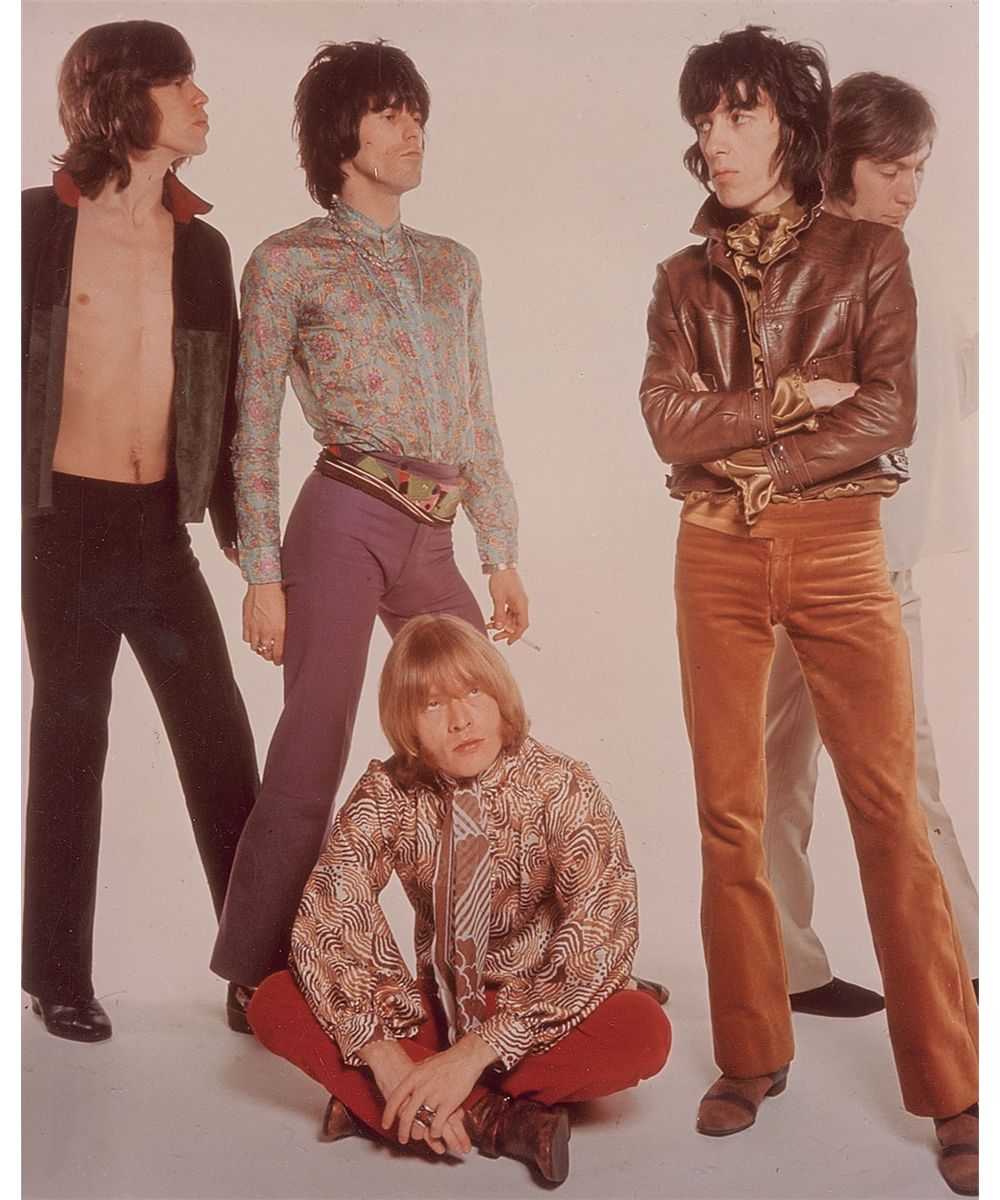Vintage ballpoint signatures of Mick Jagger, Brian Jones, Keith Richards, Bill Wyman, and Murray the K, on a yellow 7 x 4.5 irregularly clipped sheet. In fine condition, with light scattered creases. Accompanied by an unsigned glossy photo of the band.