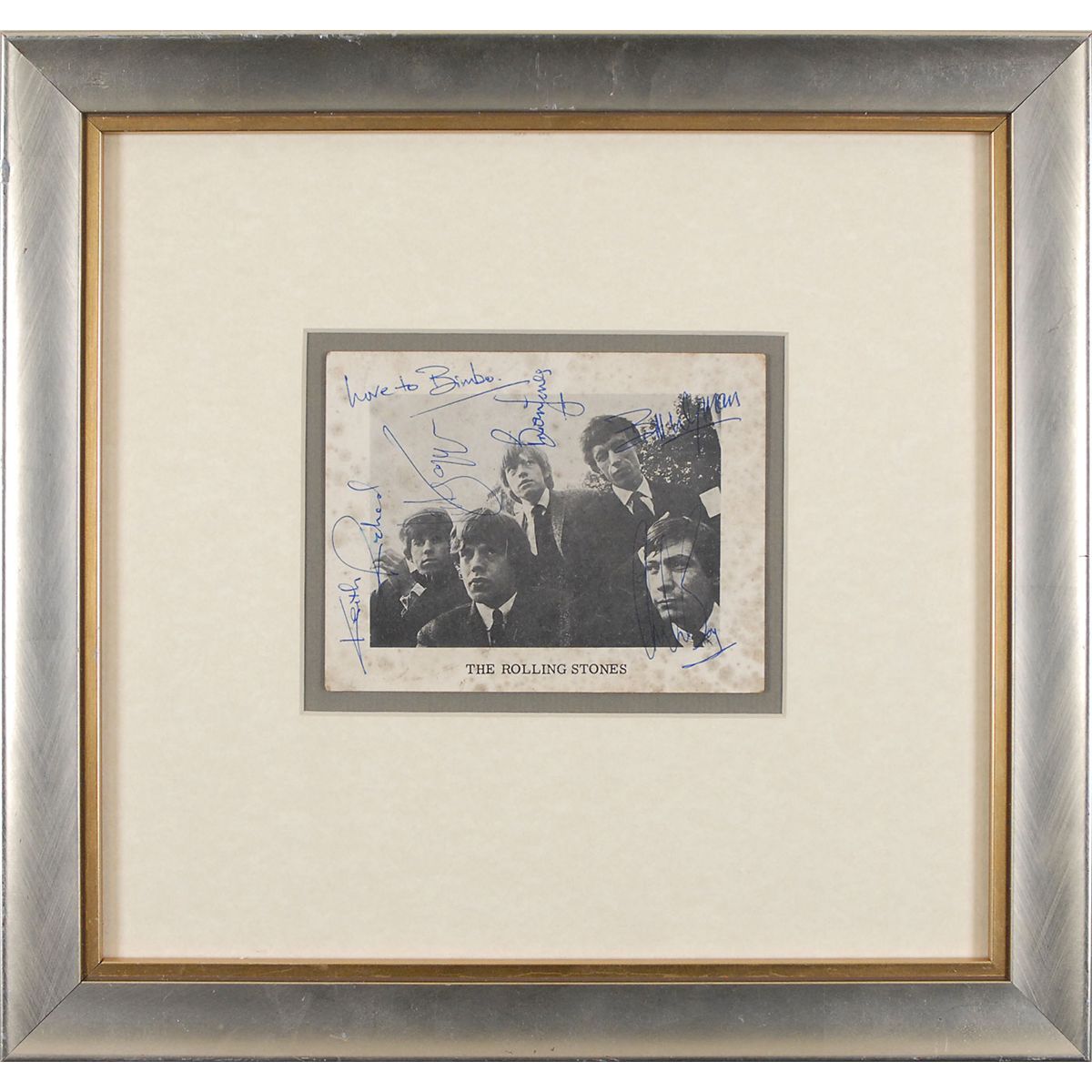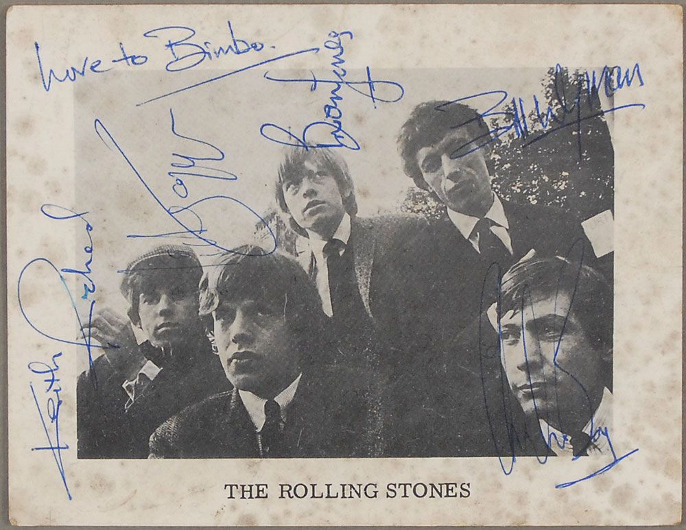 Vintage 5.5 x 4.25 photo, signed in blue ink by Mick Jagger, Keith Richards, Bill Wyman, Charlie Watts, and Brian Jones, who inscribes, “Love to Bimbo.” Matted and framed to an overall size of 13.5 x 13. Moderate spotting to borders, not affecting the bold signatures, otherwise fine condition.