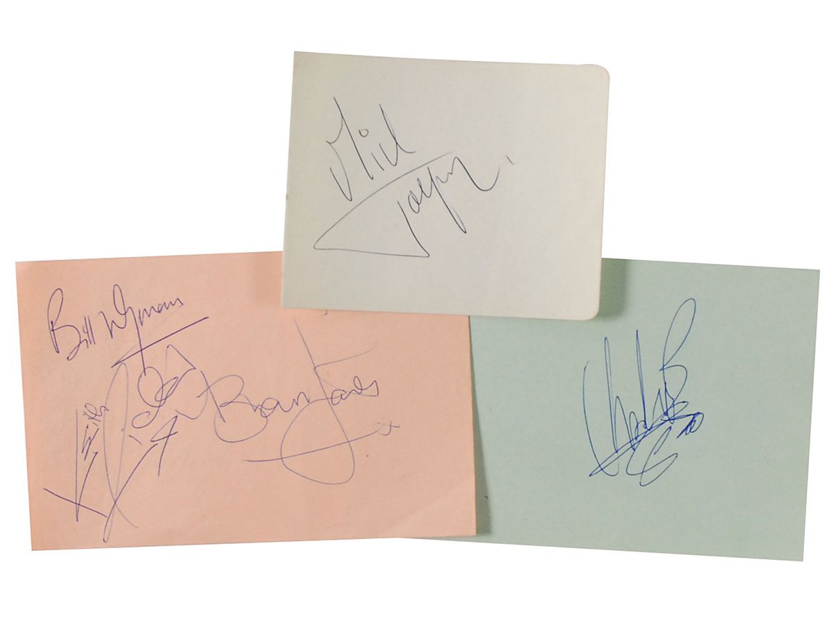 Full set of vintage mid-1960s signatures of Mick Jagger, Brian Jones, Keith Richards, Bill Wyman, and Charlie Watts on three album pages of various sizes. In overall fine condition. Accompanied by a certificate of authenticity from Tracks and letters of provenance from the original recipient, stating that she acquired the autographs at a concert at the Huddersfield ABC Theatre.