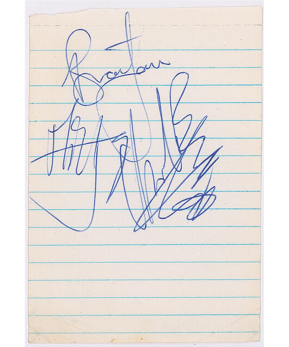 Choice vintage ballpoint signatures of Mick Jagger, Brian Jones, and Charlie Watts on an off-white 3 x 4.5 lightly-lined notepad sheet; and their Big Hits (High Tide and Green Grass) album signed on the front cover in black felt tip by Keith Richards and Bill Wyman. In overall fine condition. The record is included. An excellent full set of Stones signatures in superb condition.