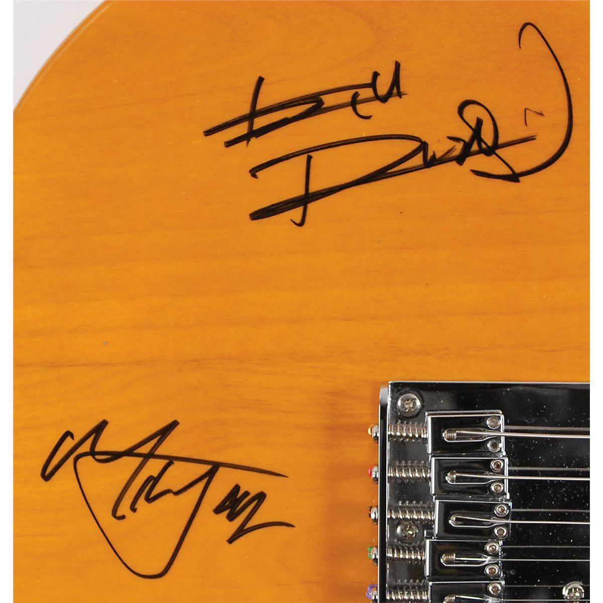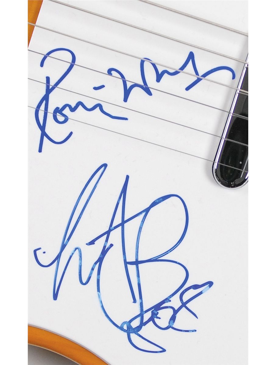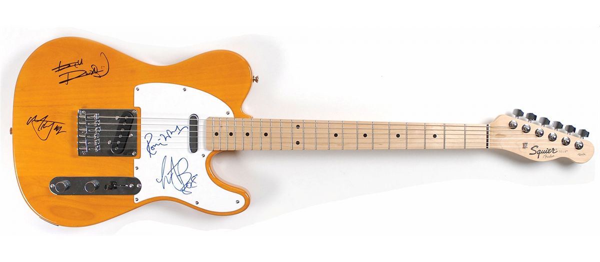 Wood-finish Fender Squier ‘telecaster-style’ electric guitar, signed on the body in black felt tip by Mick Jagger and Keith Richards, and on the white pickguard in blue felt tip by Ronnie Wood and Charlie Watts. In fine condition. Band-signed instruments are rather uncommon, with this being an exceptional example.