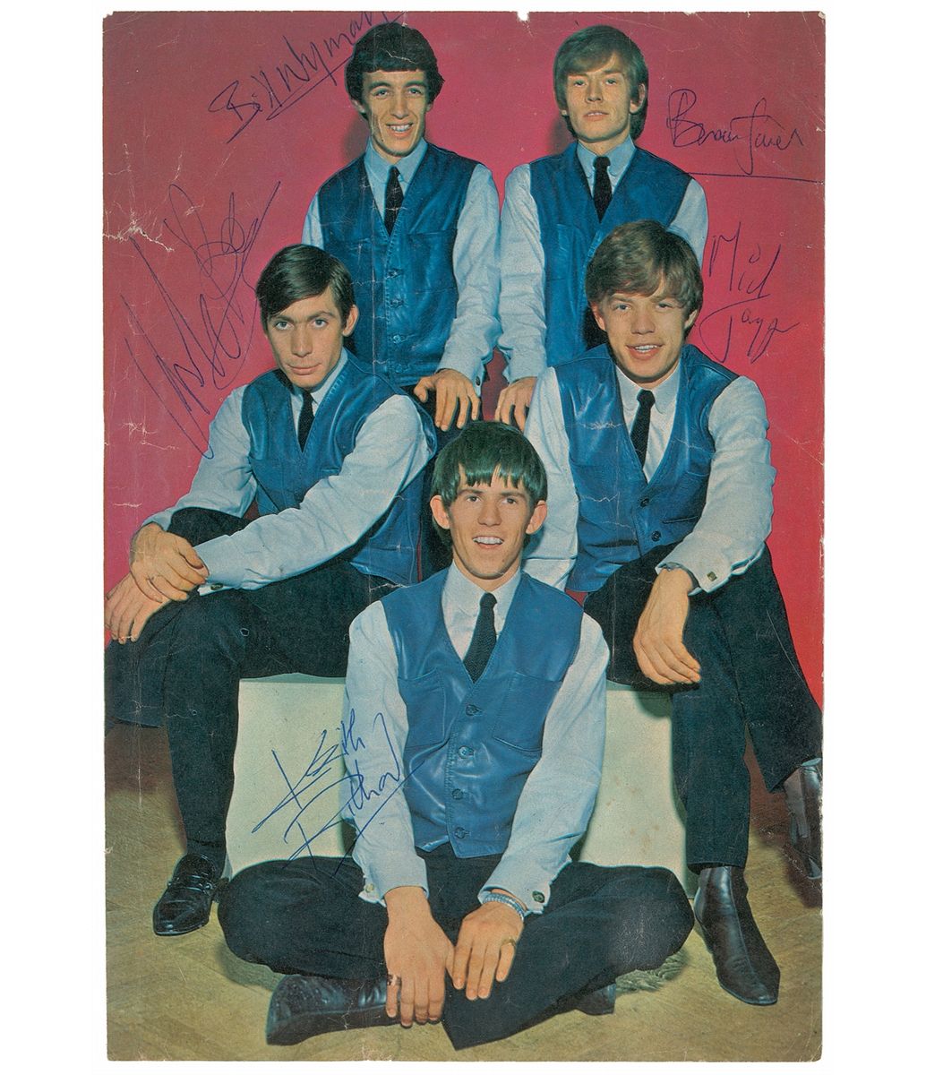 Very early color vintage 7.25 x 10.5 magazine photo of the Stones in matching outfits, signed in blue ballpoint by Mick Jagger, Keith Richards, Brian Jones, Bill Wyman, and Charlie Watts. Signatures were obtained in Derby when the Stones were playing a concert at the Gaumont Theatre on October 11, 1963. Accompanied by an email from the original recipient stating he obtained the autographs when the Stones were en route to the venue. In very good condition, with scattered creases, a light vertical fold, and a few small edge tears, one above Watts’s signature. Less than two weeks earlier, the Stones had begun their very first British tour, performing two shows a day at each venue. A particulalrly early item acquired at the very beginning of their careers when they were easily accessible to their fans.
