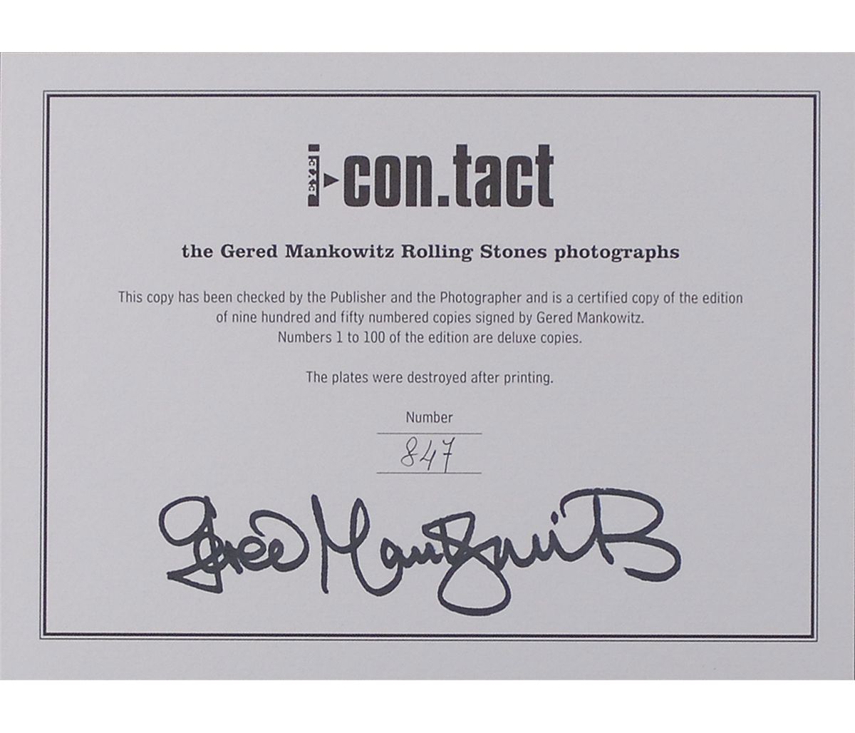 Signed book: Eye-Contact: The Complete Black-and-White Rolling Stones Archive of Gered Mankowitz. Limited edition, numbered 847/950. Surrey, England: Genesis Publications, 1998. Hardcover with slipcase, 17.5 x 12, 208 pages. Signed on a bookplate affixed to the front pastedown in black felt tip by Mankowitz. In very fine condition.