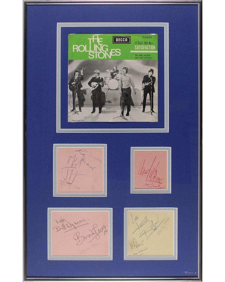 Vintage ballpoint signatures of Mick Jagger, Keith Richards, Brian Jones, and Charlie Watts and a vintage pencil signature of Bill Wyman, on four album pages, with one page also signed by Ian Stewart and Jagger’s page signed by one other, with small collector’s notations to the pages. All four are double-matted and framed with an original 45 rpm sleeve for ‘(I Can’t Get No) Satisfaction,’ to an overall size of 14 x 22. In fine condition.