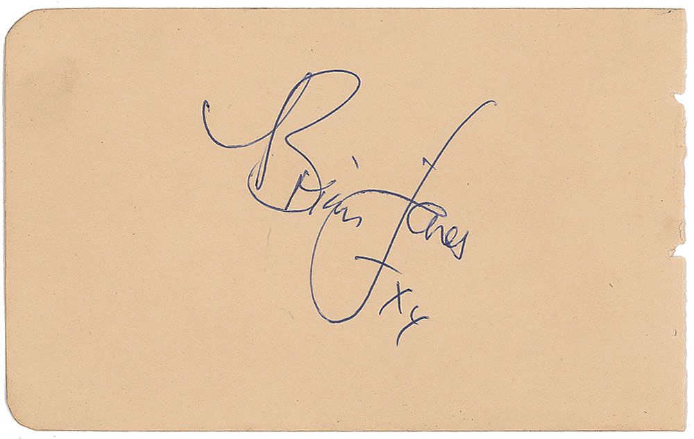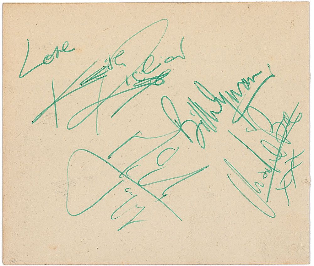 Vintage ballpoint signatures of Mick Jagger, Keith Richards, Charlie Watts, and Bill Wyman on an off-white 4.5 x 4 album page; and a ballpoint signature, “Brian Jones xx,” on an off-white 4.75 x 3 album page. In fine condition.