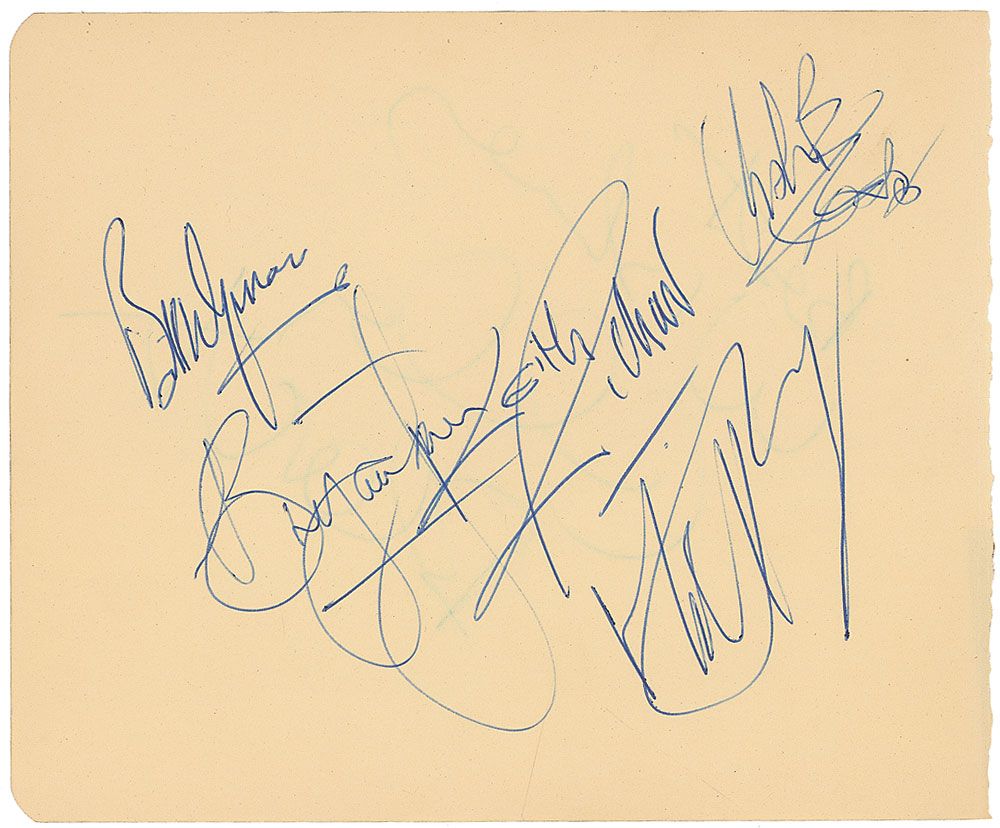 Vintage ballpoint signatures of Mick Jagger, Keith Richards, Brian Jones (who curiously signs as “Bryan Jones”), Charlie Watts and Bill Wyman on a light yellow 6.5 x 5.5 album page. In fine condition, with a couple of signatures slightly overlapping.