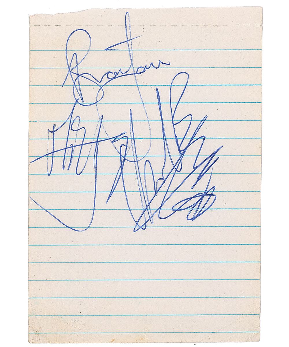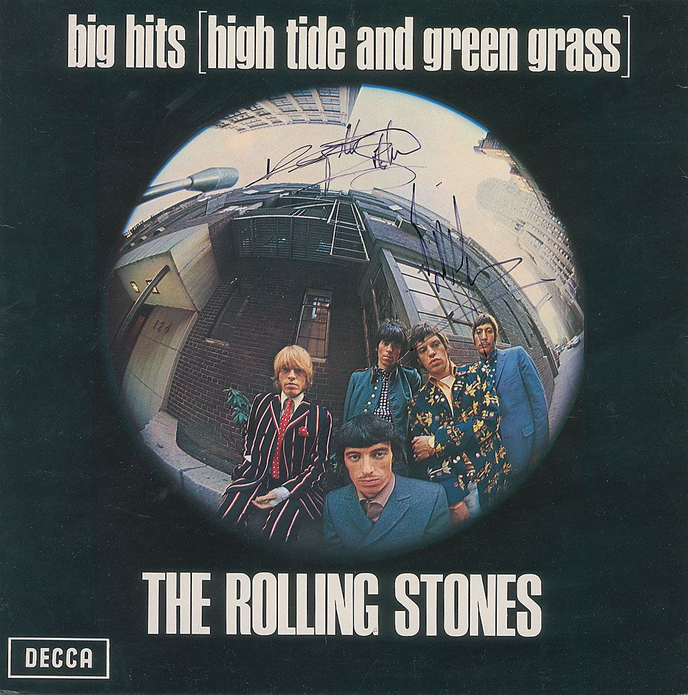 Choice vintage ballpoint signatures of Mick Jagger, Brian Jones, and Charlie Watts on an off-white 3 x 4.5 lightly-lined notepad sheet; and their Big Hits (High Tide and Green Grass) album signed on the front cover in black felt tip by Keith Richards and Bill Wyman. In overall fine condition. The record is included. An excellent full set of Stones signatures in superb condition.
