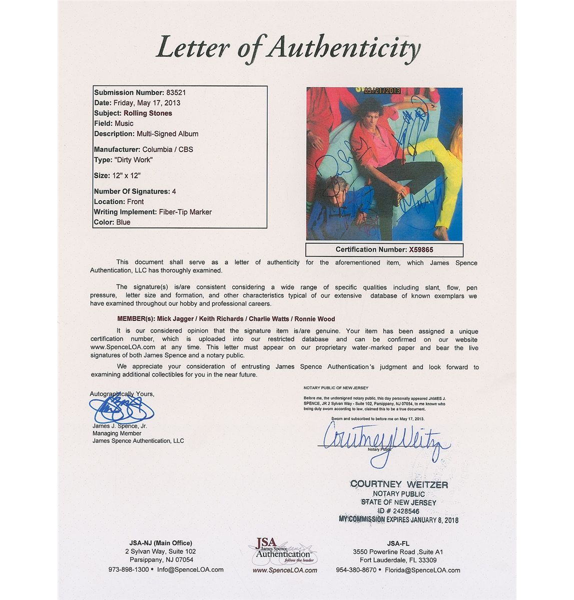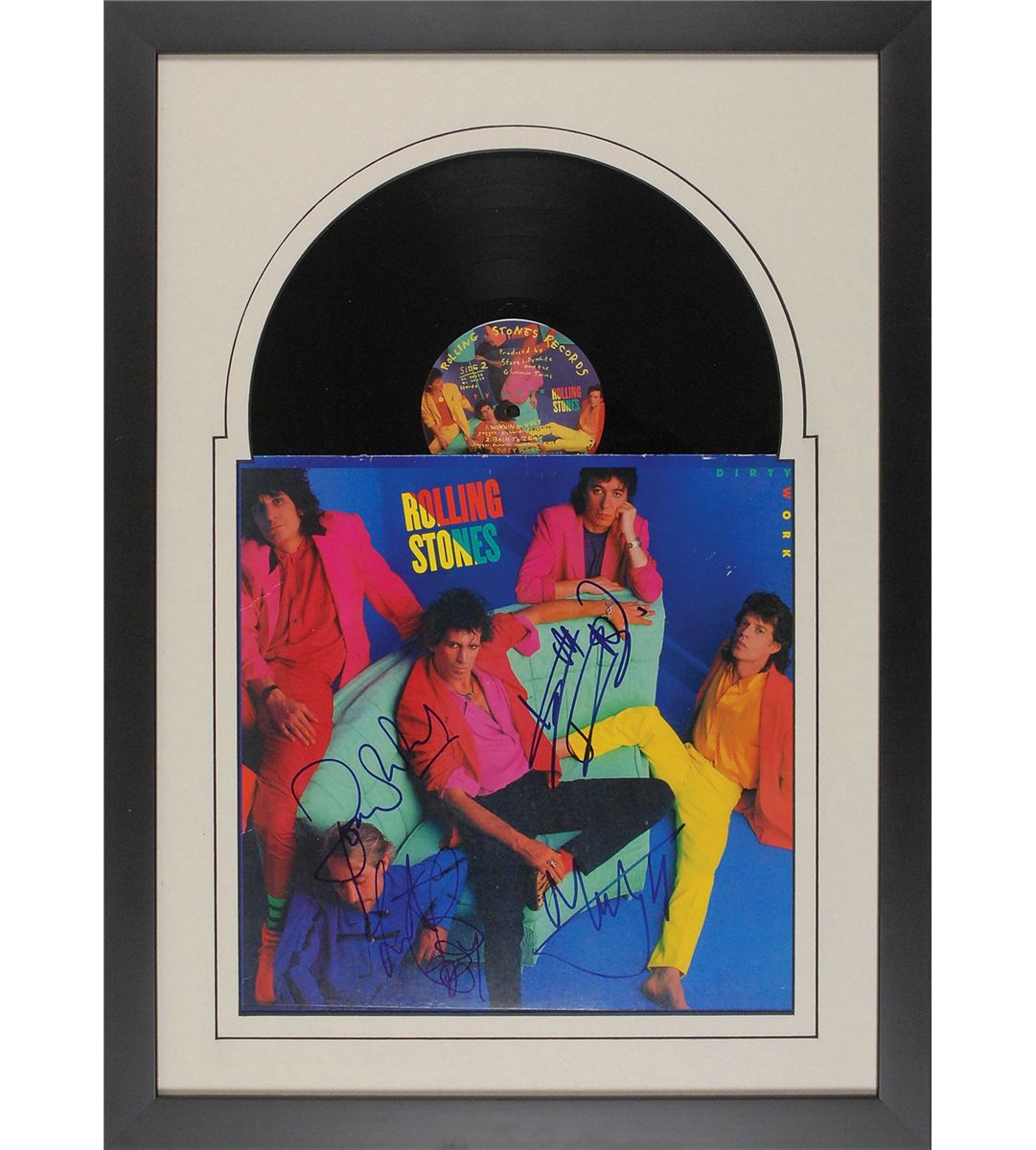 Dirty Work album signed in blue felt tip by Mick Jagger, Keith Richards, Charlie Watts, and Ronnie Wood. Expertly matted and framed with the record showing to an overall size of 18 x 25. In fine condition, with a few creases to the top edge. The record is included. Accompanied by a full letter of authenticity from JSA. Oversized.
