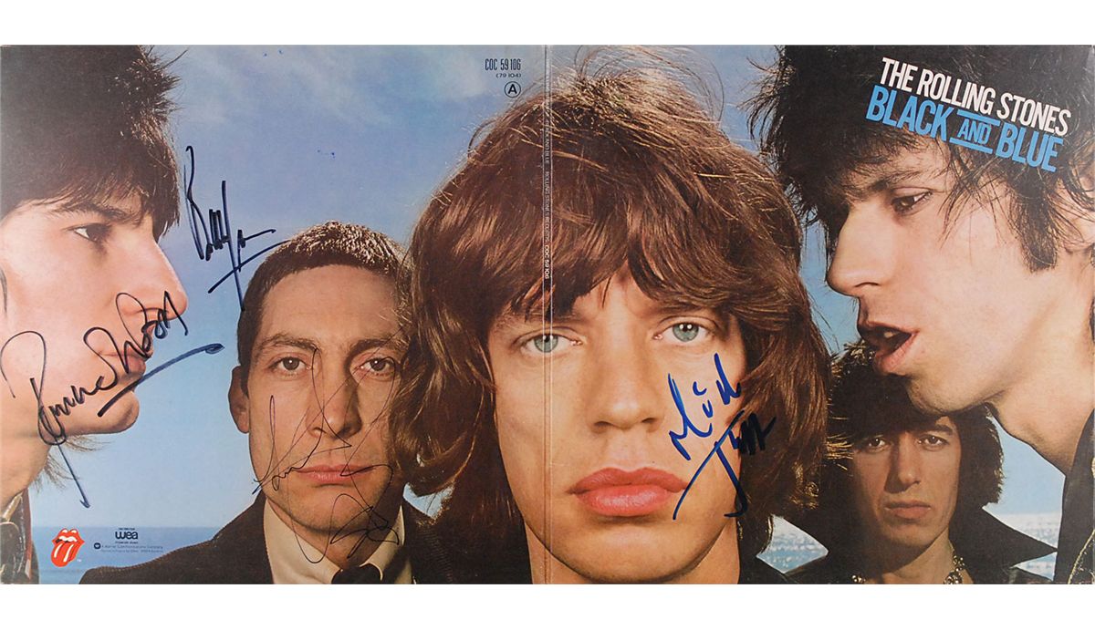 Black and Blue album signed on the front cover in blue felt tip by Mick Jagger and on the back cover in black felt tip by Ronnie Wood, Bill Wyman, and Charlie Watts. When opened, the front and rear covers appear side-by-side, providing an excellent complete image of the band with all signatures visible. In fine condition. The record is included.