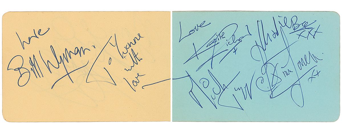 Choice set of vintage ballpoint signatures of Mick Jagger (ins), Keith Richards, Brian Jones, Bill Wyman, and Charlie Watts on two 4 x 2.75 album pages. In fine condition.