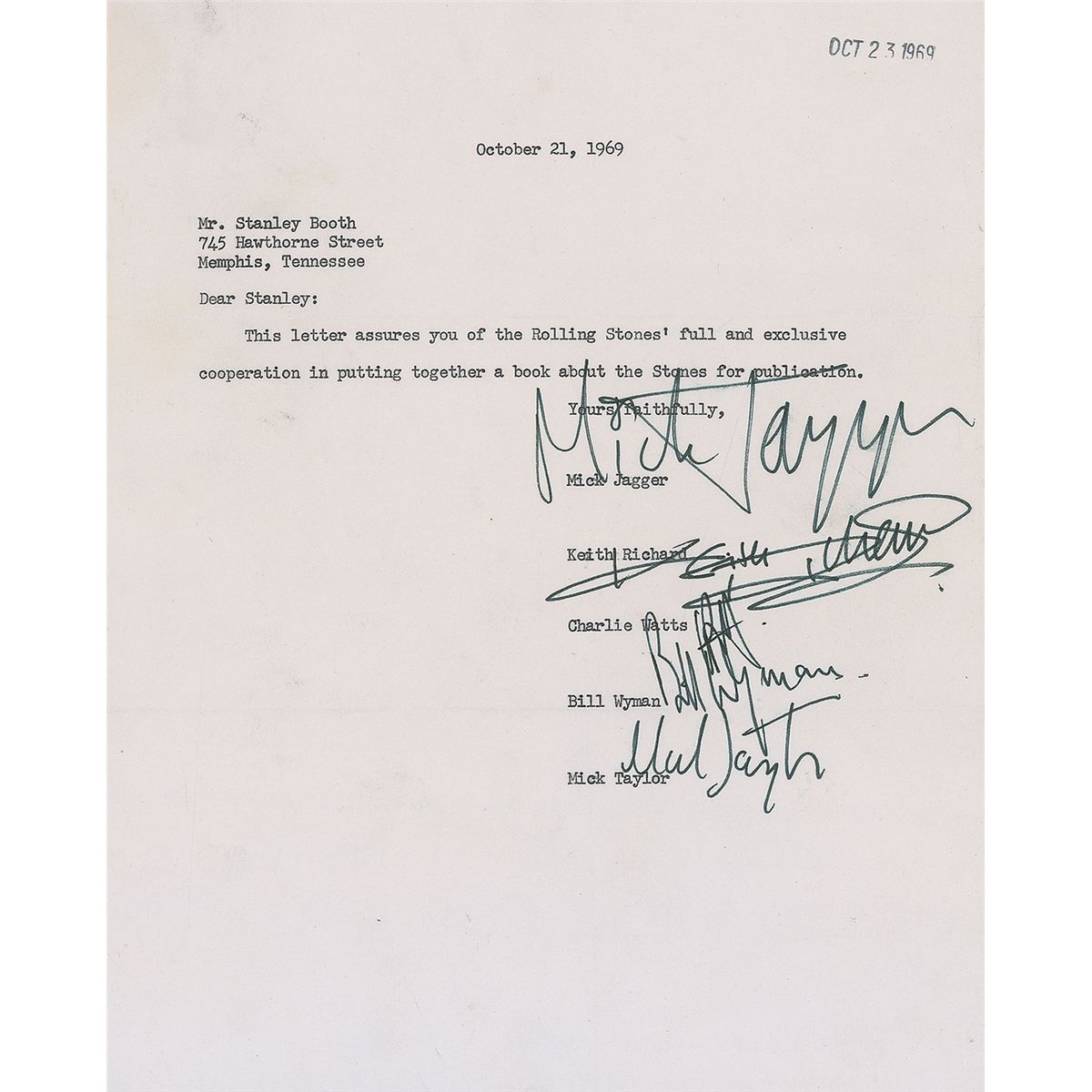Rare DS, one page, 8 x 10, October 21, 1969. Document submitted to Mr. Stanley Booth of Memphis, Tennessee. In full: “This letter assures you of the Rolling Stones’ full and exclusive cooperation in putting together a book about the Stones for publication.” Boldly signed at the conclusion in black felt tip by Mick Jagger, Keith Richards, Charlie Watts, Bill Wyman, and Mick Taylor. In fine condition. Brian Jones's increasingly erratic behavior caused him to be released from the band in June 1969, and he was found dead in his swimming pool less than a month later. At the suggestion of John Mayall, the Rolling Stones took on Mick Taylor as a replacement. Taylor only stayed with the band through 1974, due in part to a dispute over songwriting credits on the album It's Only Rock 'n Roll. Fully signed material from this era immediately following Jones’s removal and tragic death is rare. The recipient, Stanley Booth, was an up-and-coming music journalist who managed to attach himself to the Stones' infamous 1969 American tour, living and traveling with them across the country. Keith Richards called Booth the band’s ‘writer-in-residence,’ and the book spurred by this document ended up taking 15 years to complete before being released in 1984 under the title Dance with the Devil: The Rolling Stones and Their Times, now considered a classic of music journalism and one of the most accurate accounts of the Stones during their heyday. A truly marvelous piece of rock and roll history.