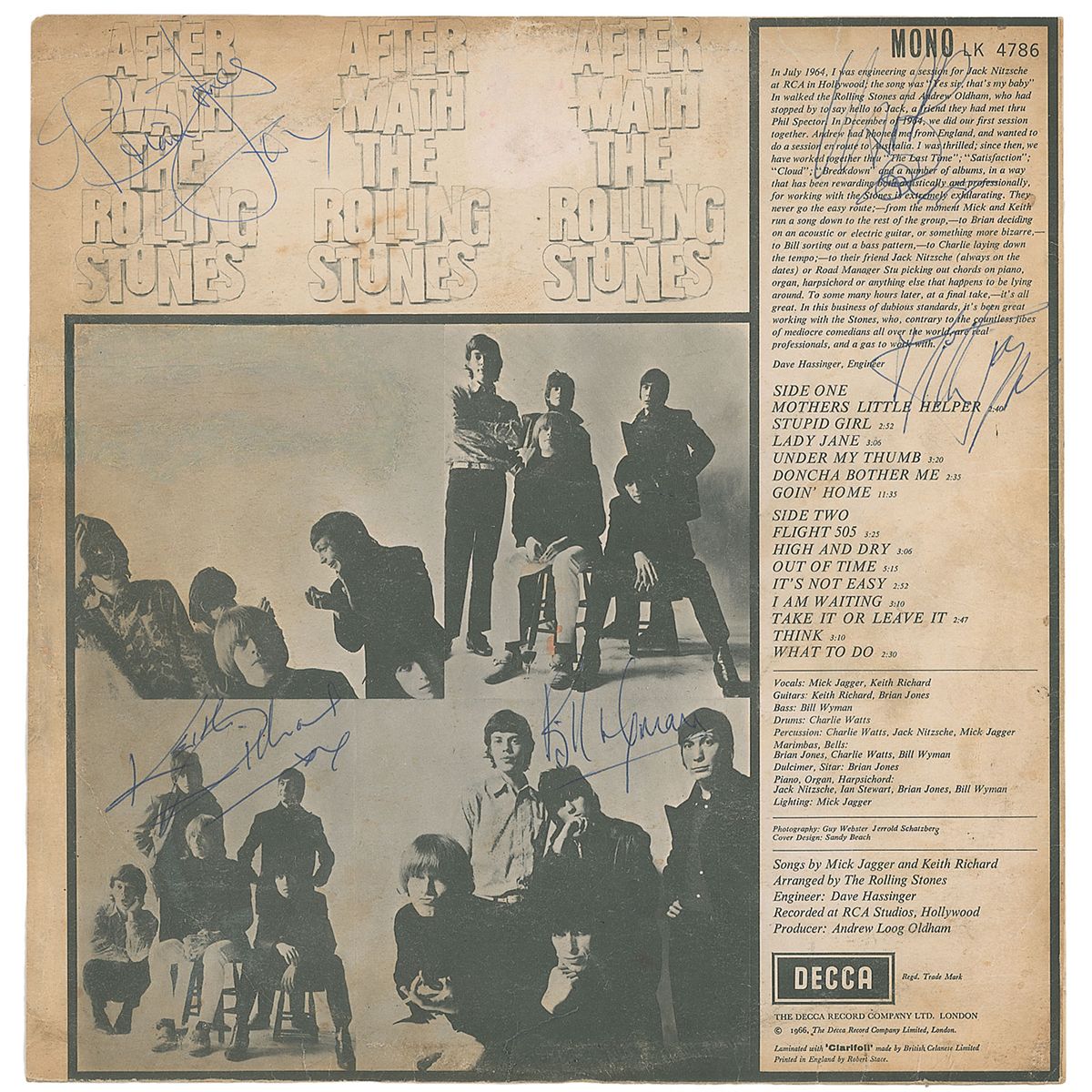 Back cover of their 1966 Aftermath album signed in blue ballpoint by Mick Jagger, Brian Jones, Keith Richards, Charlie Watts, and Bill Wyman. In very good condition, with overall staining and soiling, scattered creases, and an area of surface loss to the upper center portion. A rarely seen example of the full original lineup on an album cover, featuring bold, prominent signatures despite the overall wear.