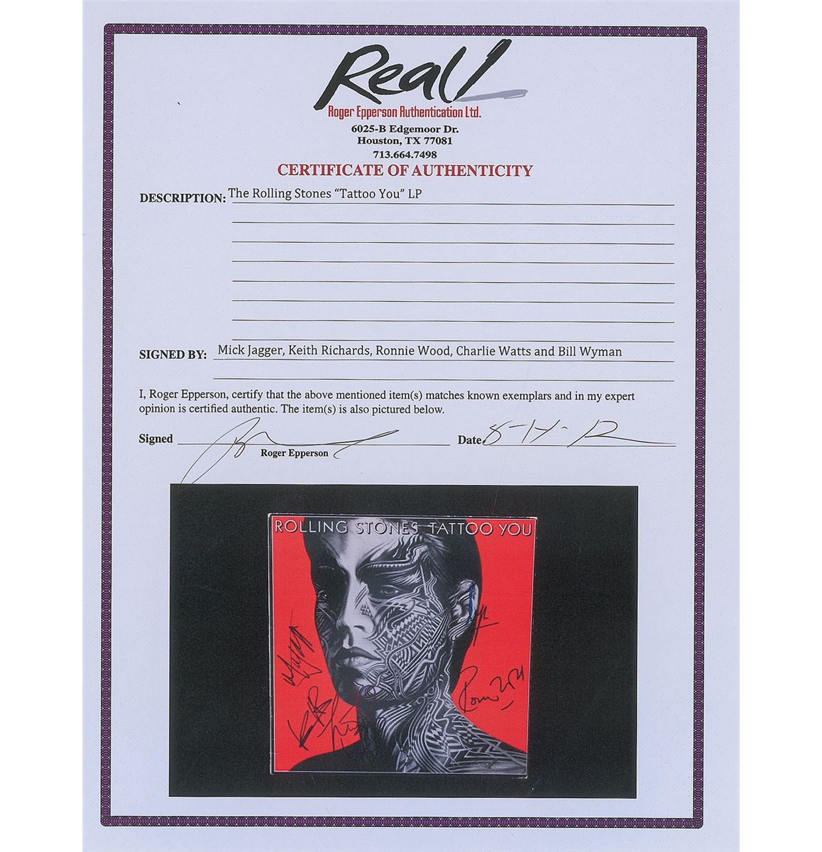 Tattoo You album signed on the front cover in blue felt tip by Mick Jagger, Keith Richards, Ronnie Wood, Charlie Watts, and Bill Wyman. In fine condition, with scattered light wear and creases to edges, and tape remnants to reverse. The record is not included. Accompanied by a full letter of authenticity from Roger Epperson/REAL.