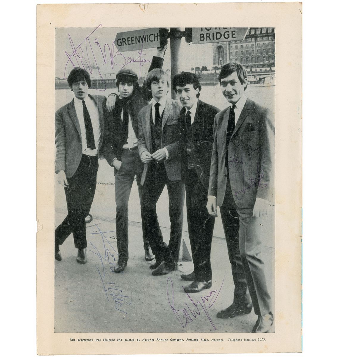 Desirable program for the Rolling Stones’ August 1964 UK tour, 7.75 x 10.25, signed on a full-page image on the back cover in ballpoint by Mick Jagger, Brian Jones, Keith Richards, Charlie Watts, and Bill Wyman. In very good condition, with scattered creases, light soiling, a few edge chips and small tears, and light contrast to Watts’s signature against his dark suit. Accompanied by a certificate of authenticity from Tracks and a letter of provenance from the original recipient, stating that her father became friendly with Jagger while working as the head stage manager at the Empire Theatre. This August 1964 tour came after their first-ever tour of America in June; it commenced on August 1st in Belfast, but the concert had to be stopped after 12 minutes due to mass hysteria. An exceptional piece from the period that saw the Stones emerge as a worldwide phenomenon.