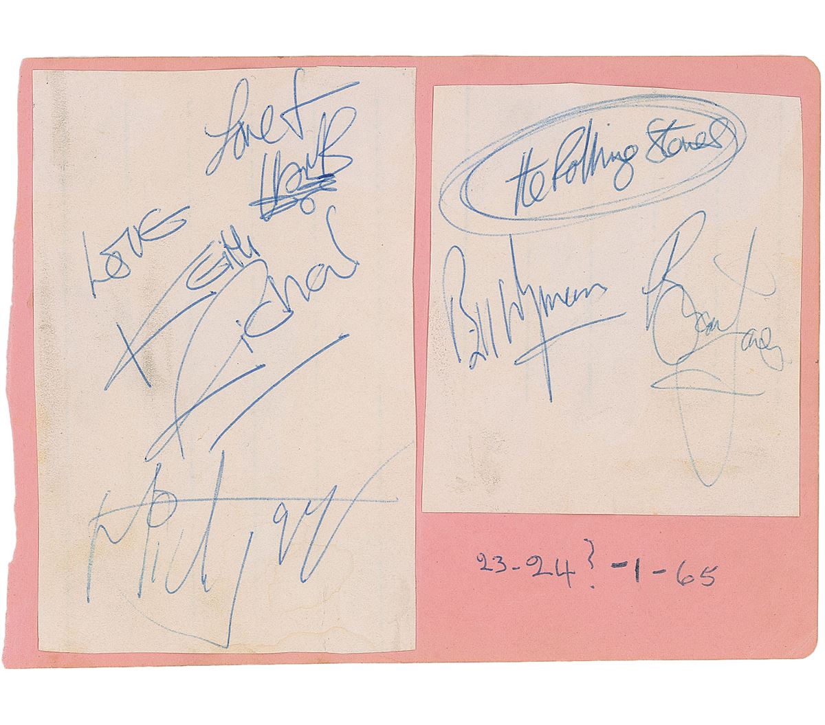 Vintage ballpoint signatures on two separate slips affixed to a pink 6.5 x 4.75 album page, one signed “Mick Jagger” and “Love, Keith Richards,” and the other signed “Brian Jones” and “The Rolling Stones, Bill Wyman.” A collector’s notation on the album page dates the signatures to late January 1965. Overall wrinkling and light toning from adhesive to reverse, otherwise fine condition.