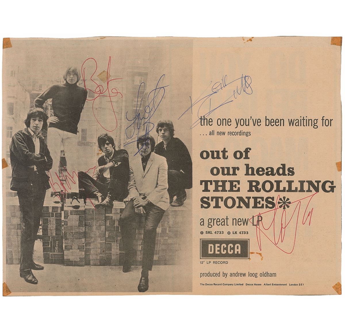 Fantastic vintage circa 1965 promotional ad for Out of Our Heads clipped from a newspaper or magazine, 10.25 x 7.75, signed in red ballpoint by Mick Jagger, Brian Jones, and Bill Wyman, and in blue ballpoint by Keith Richards and Charlie Watts. Toned tape remnants to edges, one small piece of tape affecting Jones’s signature, and a couple tiny stains, otherwise fine condition. The ad bills their third studio album as “The one you’ve been waiting for” and “a great new LP.” A highly desirable larger-than-usual fully signed example.