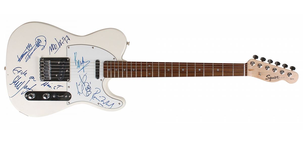 Light cream-bodied Fender Squire Telecaster electric guitar, signed on the pickguard in felt tip by Ronnie Wood, Charlie Watts, and Bill Wyman, and on the body by Mick Jagger, Keith Richards, and Mick Taylor, who adds “Exile on Main St.” The pickup selector switch cleanly snapped off but still present, otherwise fine condition. A gorgeous guitar highlighted by the presence of six band members and Taylor’s reference to the group’s mammoth 1972 double album. Oversized.