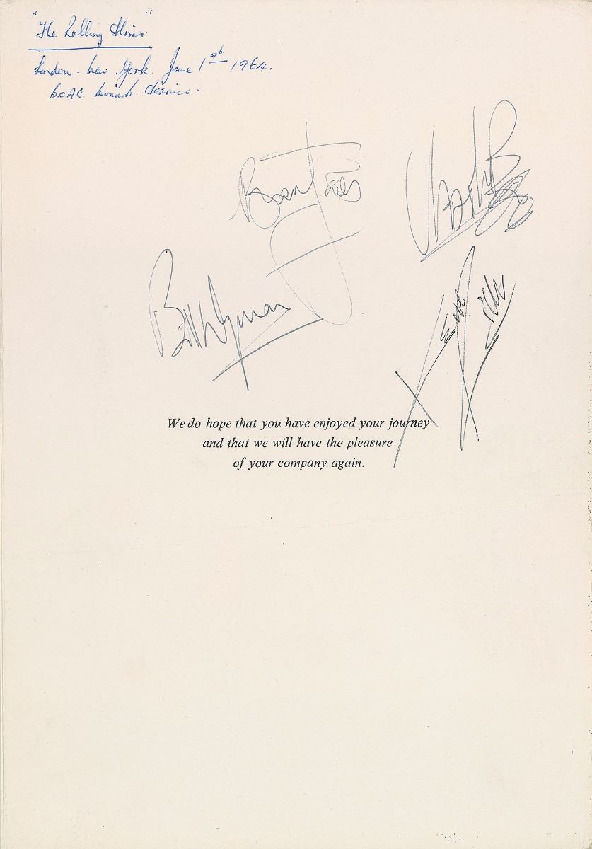 Menu for a British Overseas Airways Corporation–Cunard flight from London to New York on June 1, 1964, six pages, 7.5 x 10.75, signed on the last page in black ballpoint by Keith Richard, Brian Jones, Charlie Watts, and Bill Wyman. In fine condition, with a horizontal crease well away from the signatures. Accompanied by a letter of provenance from the stepson of the original recipient, in part: “This letter is to confirm that the Rolling Stones signatures on the BOAC menu, were obtained by my stepfather Edward McGeehan…I was 14 years old at the time, and he was a senior Navigator for BOAC. He described the Stones as being a ‘Scruffy bunch of people’ and had no use for them. He knew I was a fan, and so went out of his way to obtain their autographs, somehow missing Mick Jaggers. A very disappointing error for me; but it is ‘the thought that counts.’” In June of 1964, the Stones traveled to the USA to start their first ever tour of the country. During their two-week stay, the band played a total of twelve shows, performed live on a variety of television shows, and even found time to record multiple songs at Chicago’s Chess Studios.