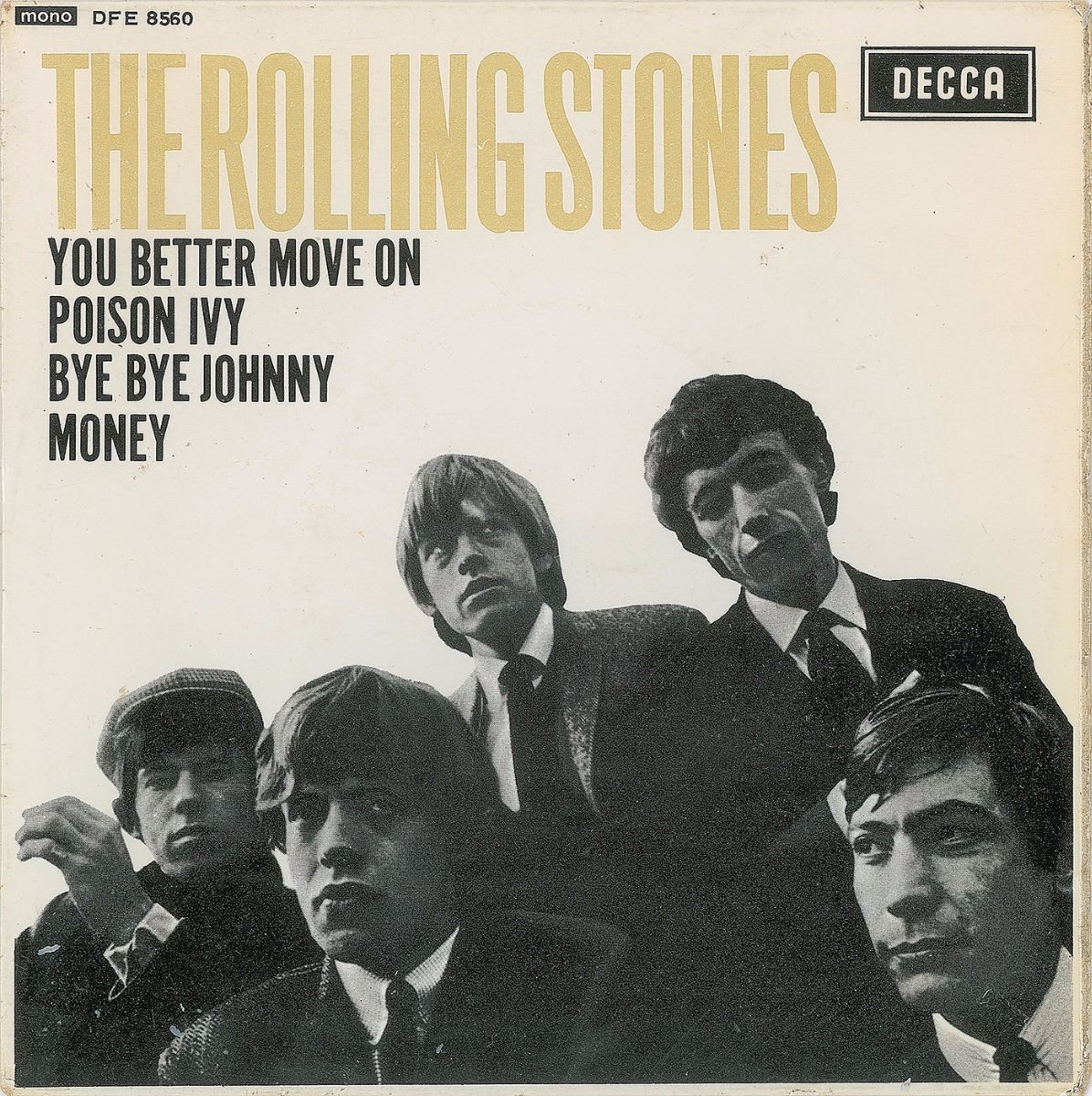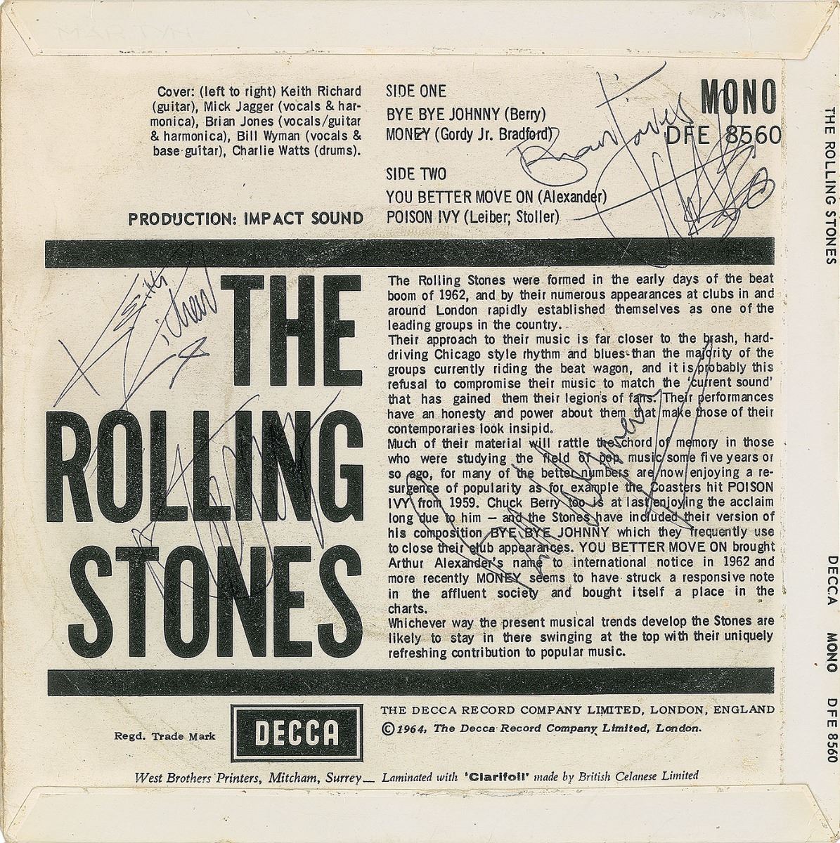 The Rolling Stones self-titled debut EP signed on the reverse of the sleeve in black ballpoint by Mick Jagger, Brian Jones, Keith Richards, Charlie Watts, and Bill Wyman. In fine condition, with expected light wear to the sleeve. The record is included. Accompanied by a certificate of authenticity from Tracks and a letter of provenance from the previous owner, stating that his partner’s grandfather obtained the autographs at the Rolling Stones show at the Odeon Theatre in Folkstone, Kent, England, on May 17, 1964. A highly sought-after early example.