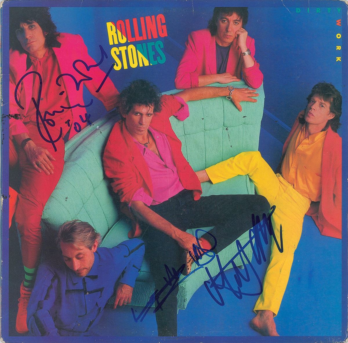 Dirty Work album signed on the front cover in blue felt tip by Keith Richards, Mick Jagger, and Ronnie Wood, who adds “‘04.” In fine condition. The record is included. Accompanied by a full letter of authenticity from PSA/DNA.