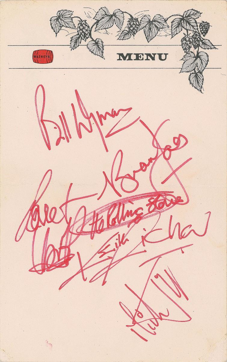 Highly appealing circa 1964 menu with a Watney’s Red Barrel logo, 5 x 8, signed in red felt tip by Bill Wyman, Brian Jones, Keith Richards, Mick Jagger, and Charlie Watts, who adds “the Rolling Stones.” In fine condition, with one central horizontal fold. Consignor notes that the signatures were obtained in Torquay, England, on August 29, 1964, after the group had performed at the Town Hall. Accompanied by a letter of provenance from the original recipient, in part: “This is a letter of verification that I the undersigned did indeed meet and speak with the very young ‘Rolling Stones,’ and obtained their autographs…During 1963 they commenced their 1st major tour, supporting more famous acts. I and my friends saw them at the Torquay Town Hall, where they supported the ‘Barron Knights.’ After the show, my friends and I went for a drink and meal, at a small Indian restaurant…This is where we met the ‘Stones’—and shared a very cheap bottle of wine, and they kindly signed a blank menu card.”