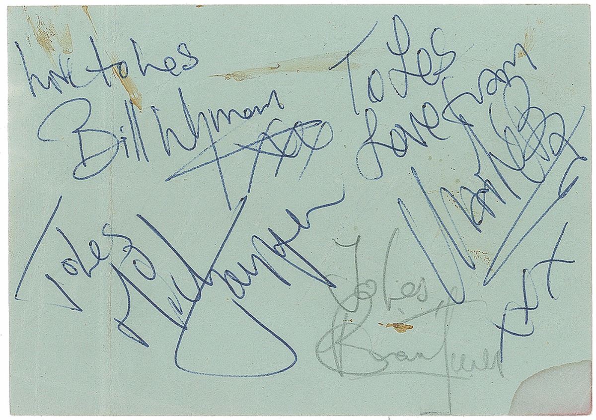 Ballpoint signatures and inscriptions, “Love to Les, Bill Wyman, xxx,” “To Les, Love from, Charlie Boy, xxx,” and “To Les, Mick Jagger,” and in pencil, “To Les, Brian Jones,” on a light green 4.25 x 3 album page. Signed and inscribed on the reverse in bold ballpoint, “Love to Les, Keith Richards, xo.” In very good condition, with scattered moderate overall creasing and a few light stains.