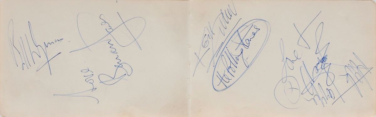 Vintage ballpoint signatures, “Bill Wyman,” “Love, Brian Jones,” “Keith Richards, the Rolling Stones,” “Love, Charlie Boy,” and “Mick Jagger, x,” on two adjoining off-white album pages, measuring open to an overall size of 11.75 x 3.75. In fine condition, with light soiling near the central hinge. Consignor notes that the signatures were obtained at Alveston, England’s The Ship Hotel after the band had performed at Bristol’s Colston Hall on October 7, 1966. An uncommon, fully signed display piece.