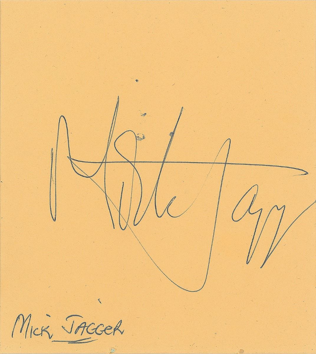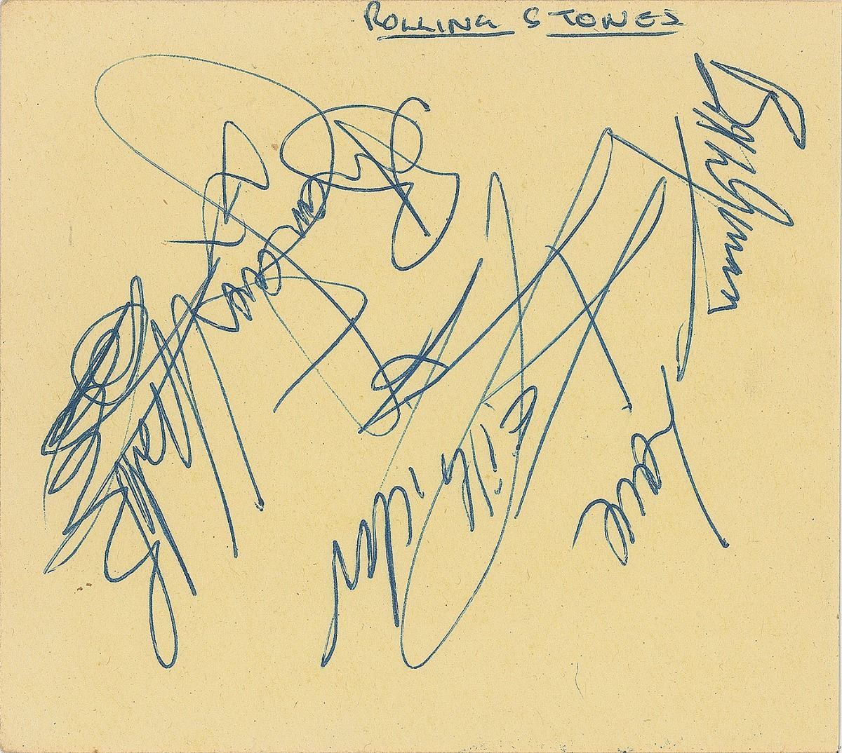Vintage ballpoint signatures, “Bill Wyman,” “Love, Keith Richards, x,” “Brian Jones, xx,” and “Charlie Boy,” on a yellow 3.75 x 4.25 album page, and a ballpoint signature, “Mick Jagger,” on an orange 3.75 x 4.25 card. In overall fine condition. Accompanied by unsigned promo card and a copy of a provenance letter from the son of the original recipient, in full: “These signatures were obtained by my mother who had backstage access when the Rolling Stones played at the Locarno Ballroom, Stevenage, on 1st April 1964.”